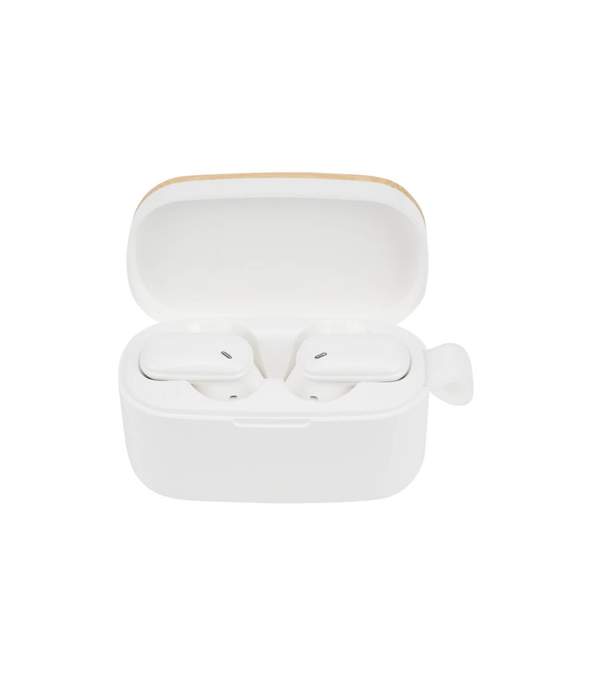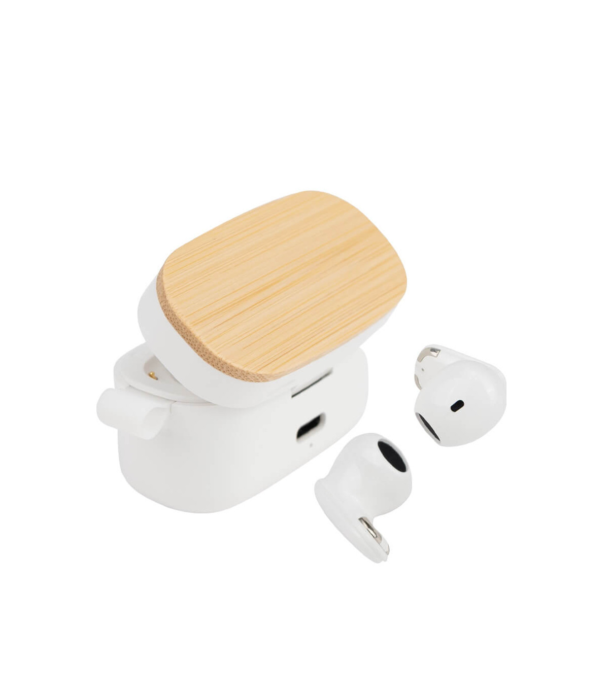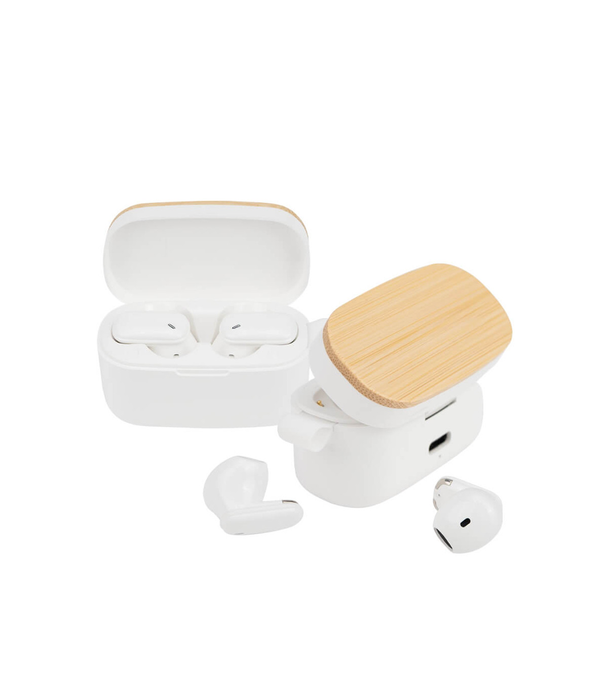 Audífonos auriculares inalámbricos en contenedor de plástico ABS color blanco con tapa de madera de bamboo, función Bluetooth Touch ID, puerto Tipo-C, emparejamiento automático, incluye par de protectores de silicona y manual de instrucciones en inglés y español. Presentación en estuche de cartulina KRAFT natural. Producto amigable con el medio ambiente.