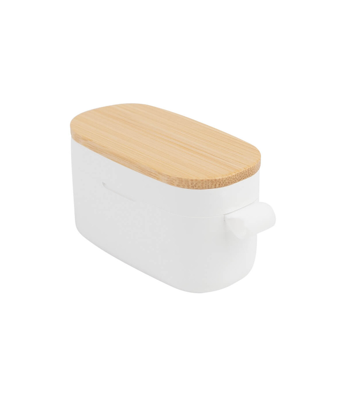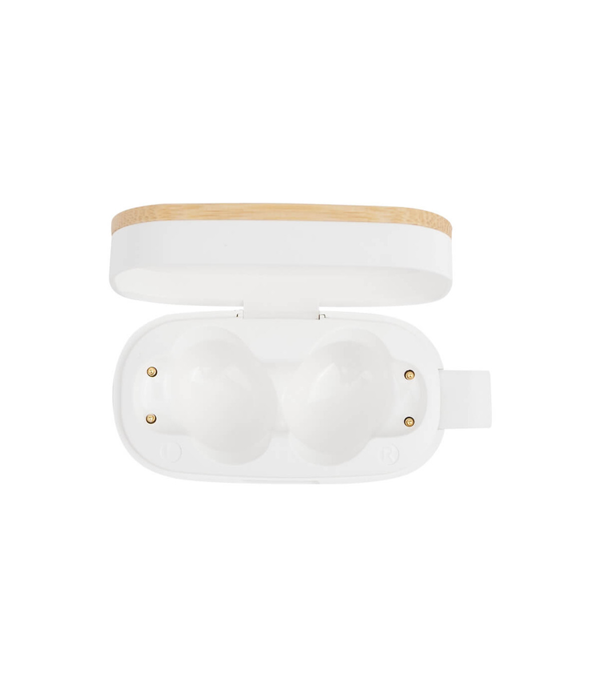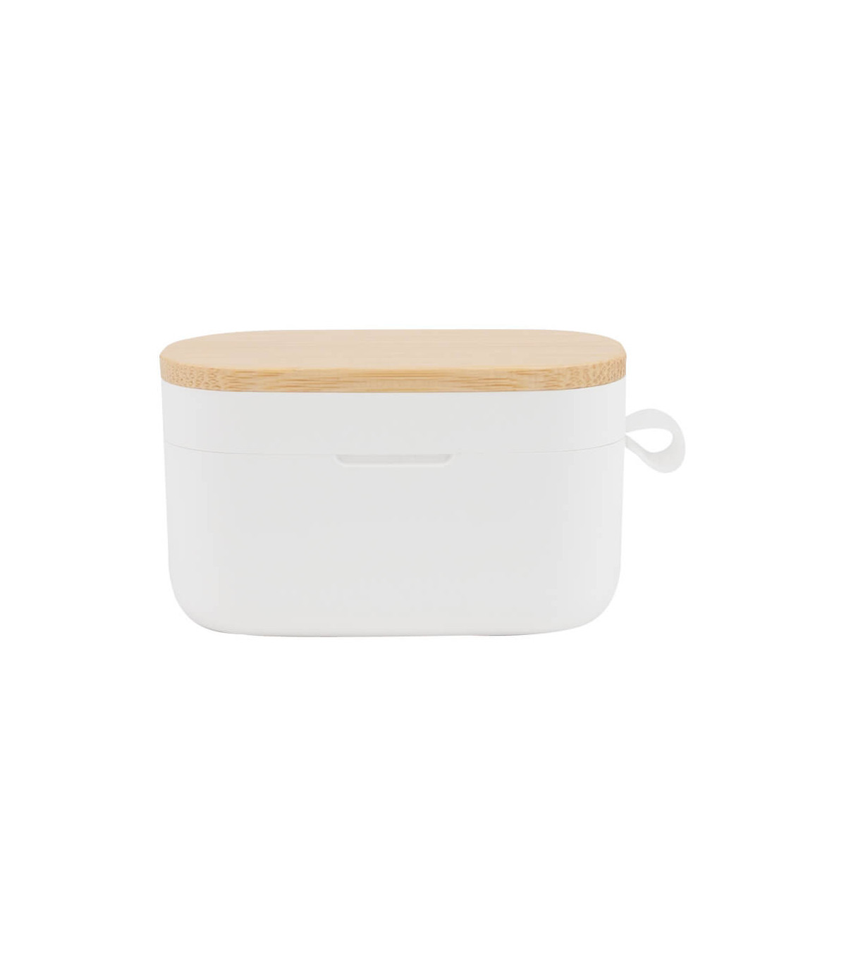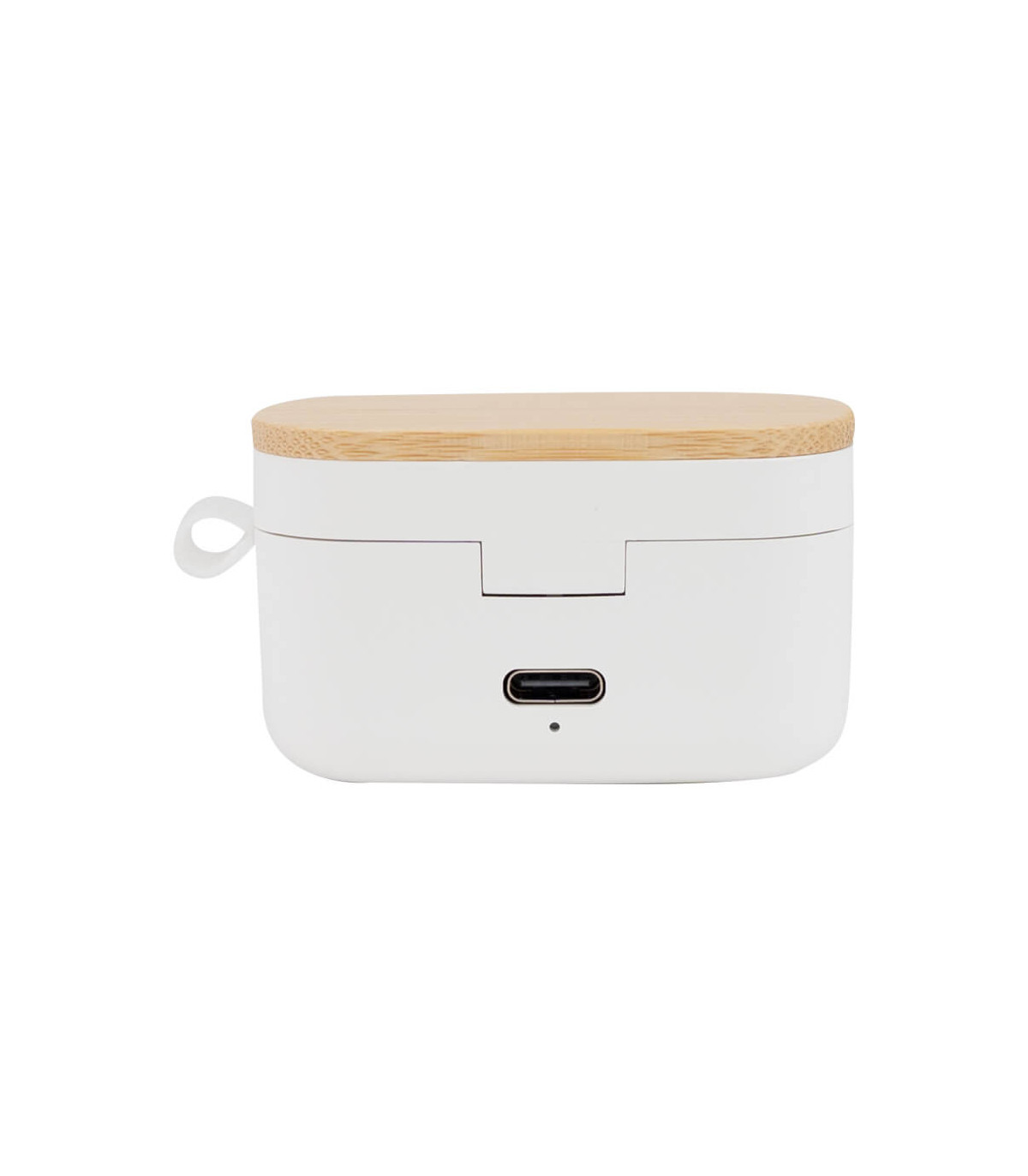 Audífonos auriculares inalámbricos en contenedor de plástico ABS color blanco con tapa de madera de bamboo, función Bluetooth Touch ID, puerto Tipo-C, emparejamiento automático, incluye par de protectores de silicona y manual de instrucciones en inglés y español. Presentación en estuche de cartulina KRAFT natural. Producto amigable con el medio ambiente.