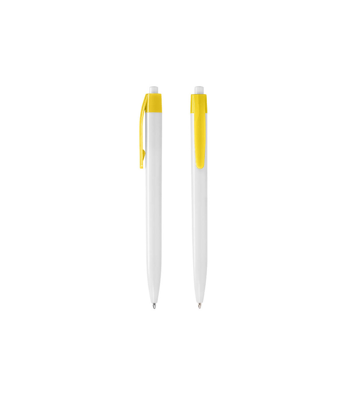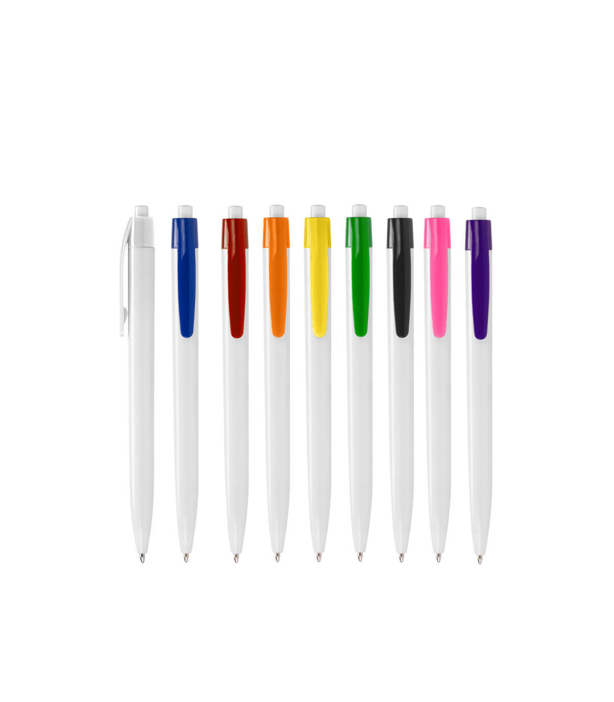 Plástico. Cuerpo blanco mate. Clip, punta y pulsador color plata. Debajo del clip detalle de color. Tinta azul.