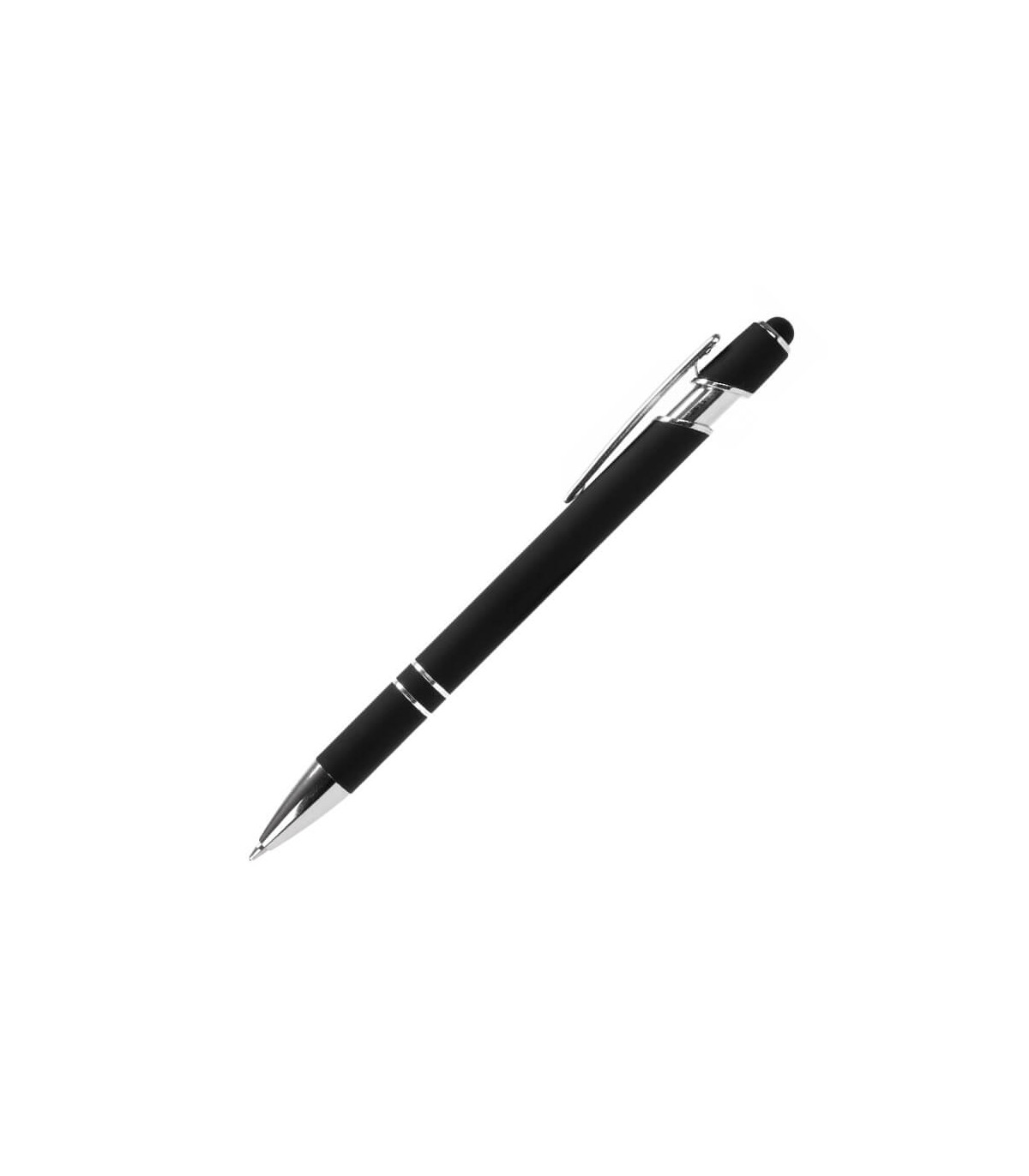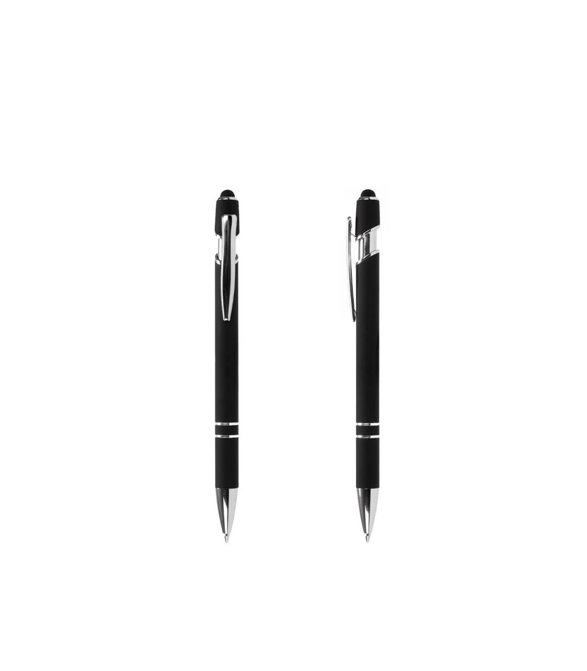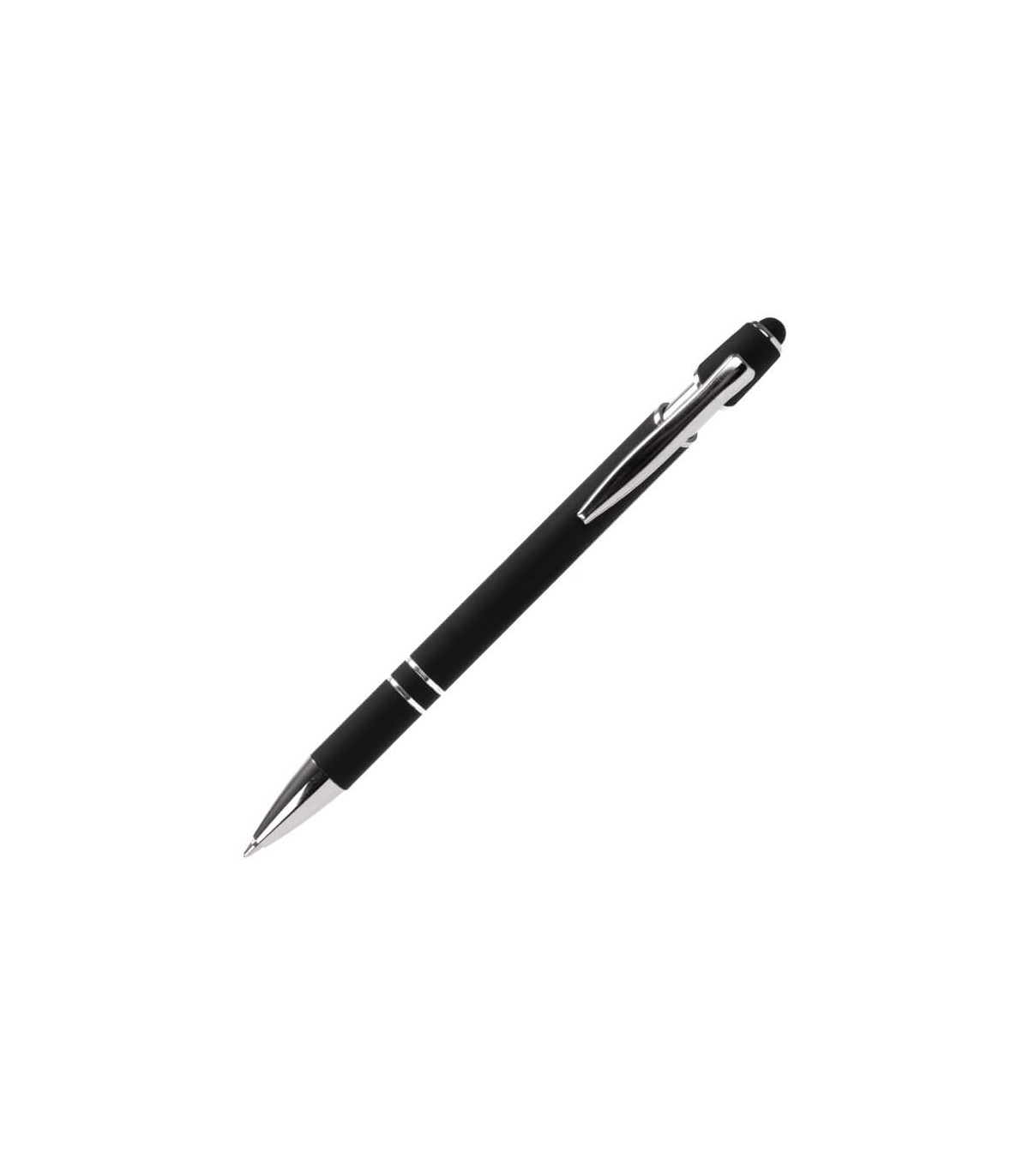 Bolígrafo metálico con cuerpo negro terminación «rubber» y terminal «touch-screen». Escritura azul.