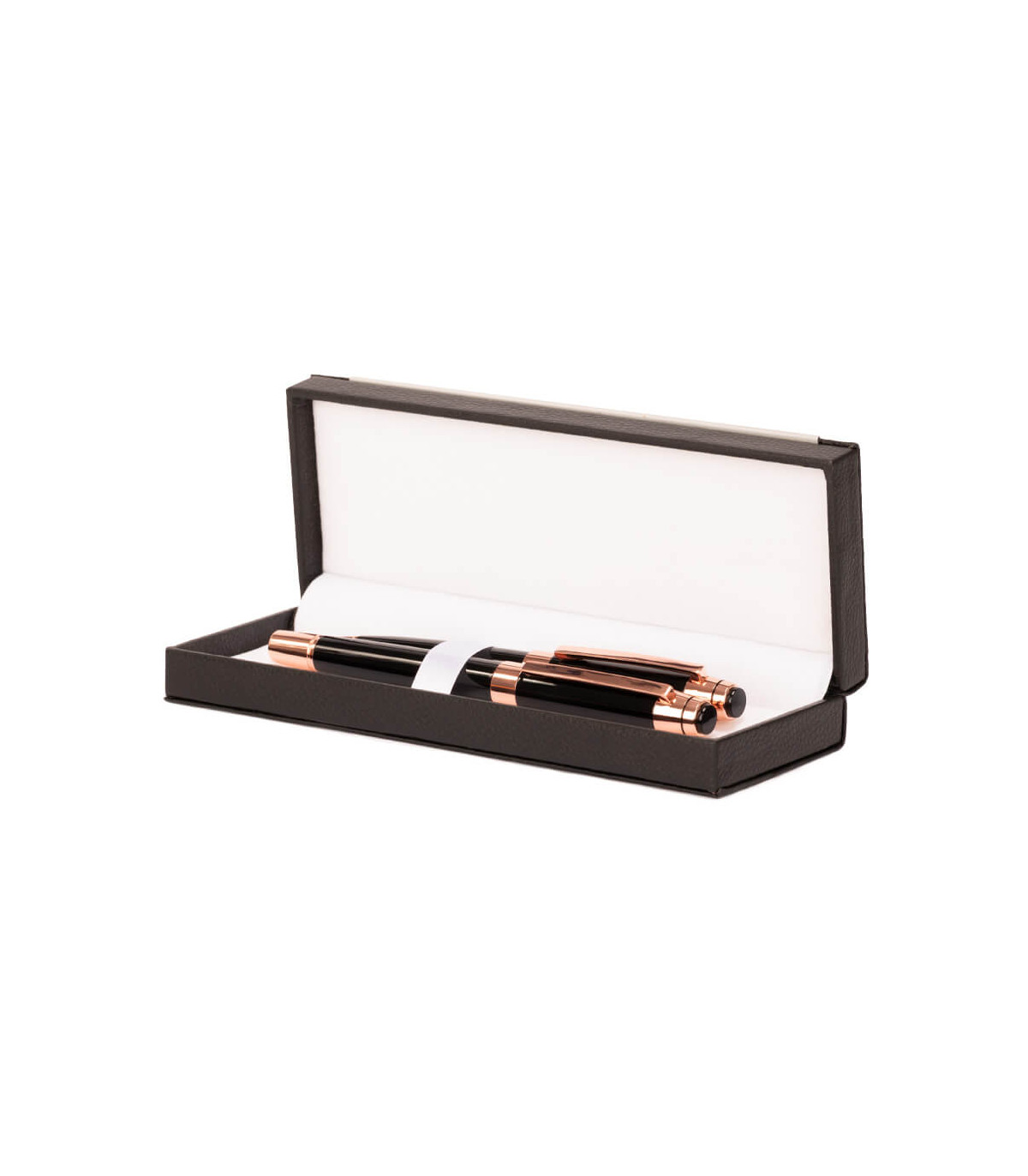 Set de Escritura «THORTON», incluye Bolígrafo metálico negro con terminales encobrizados + Roller pen metálico negro con terminales encobrizados. Presentación en elegante estuche de PU negro con ribete metálico plata opaco bruñido, interior cuna aterciopelada blanca. Sobre funda de papel color negro..