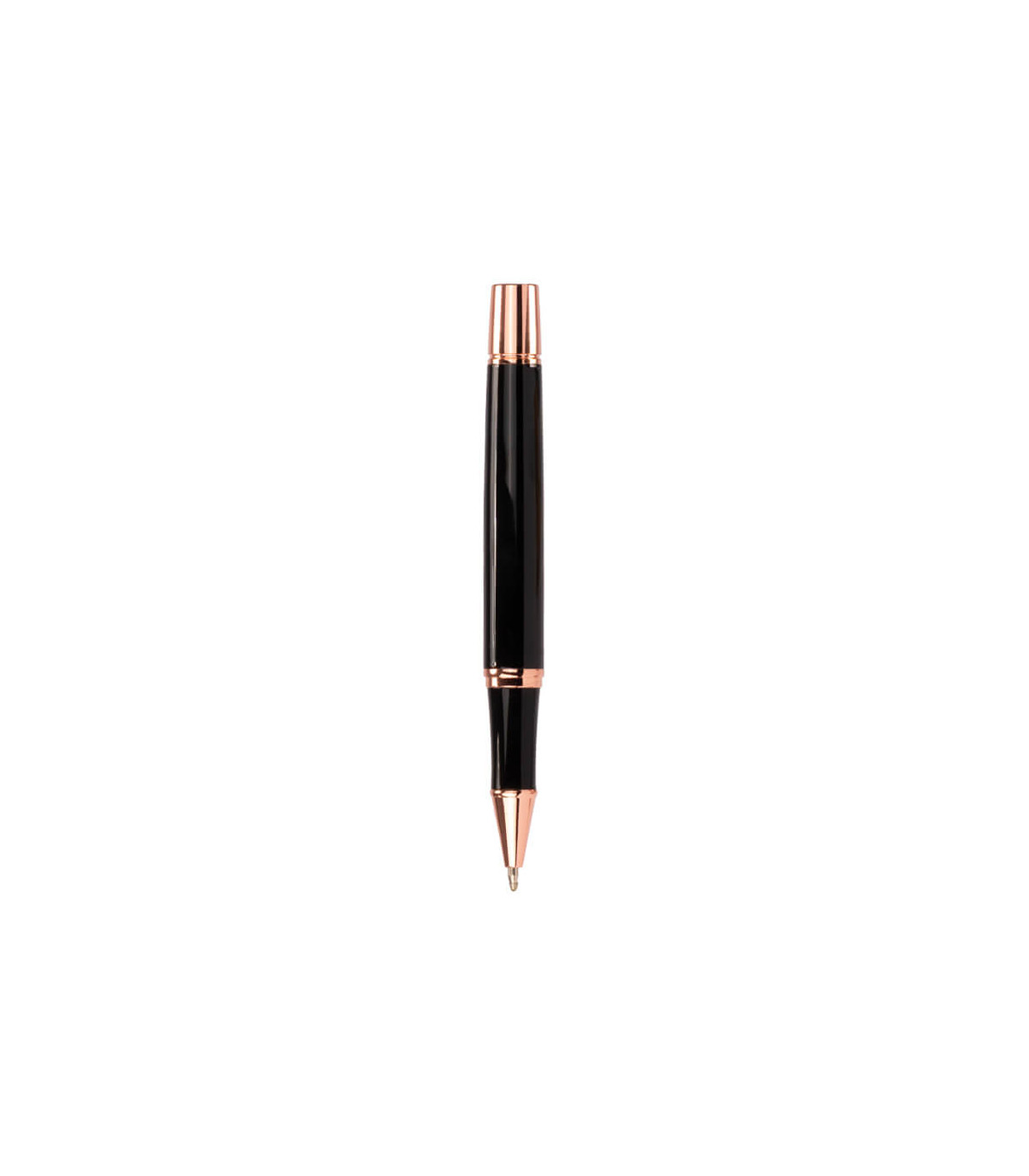 Metal. Cuerpo de aluminio, acabado engomado color negro, muy suave al tacto. Bolígrafo retráctil. Clip, puntera y detalles metálicos color cobre. Tinta Negra. Decapa color cobre.