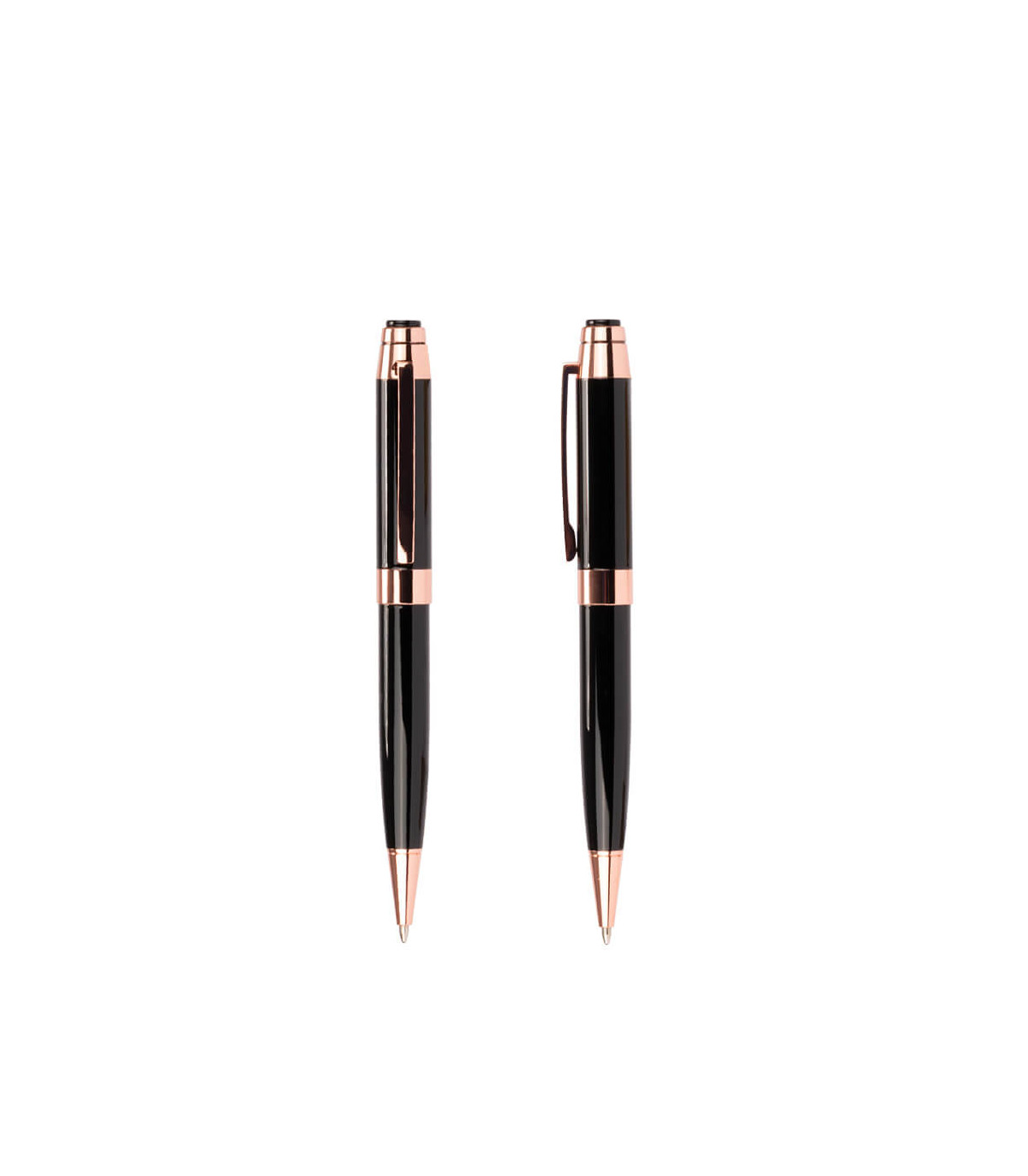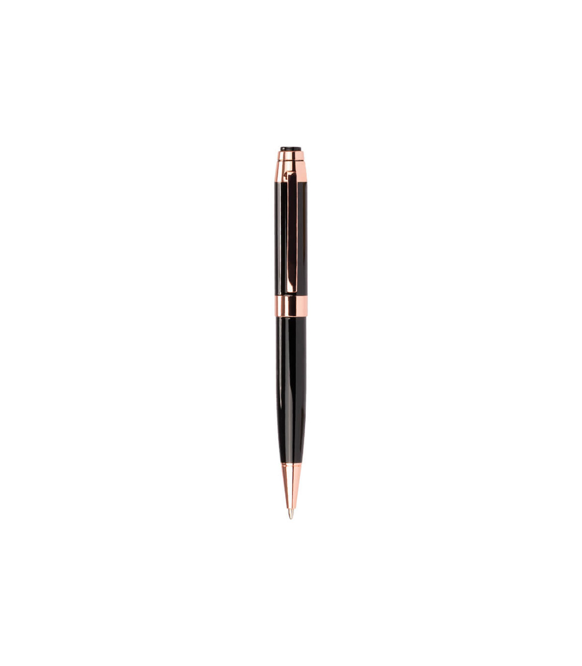Metálico. Bolígrafo con apertura giratoria. Destape cobre en la parte de arriba. Cuerpo negro. Detalles en clip, arco circular y punta color cobre. Tinta negra. Estuche con cierre imantado.