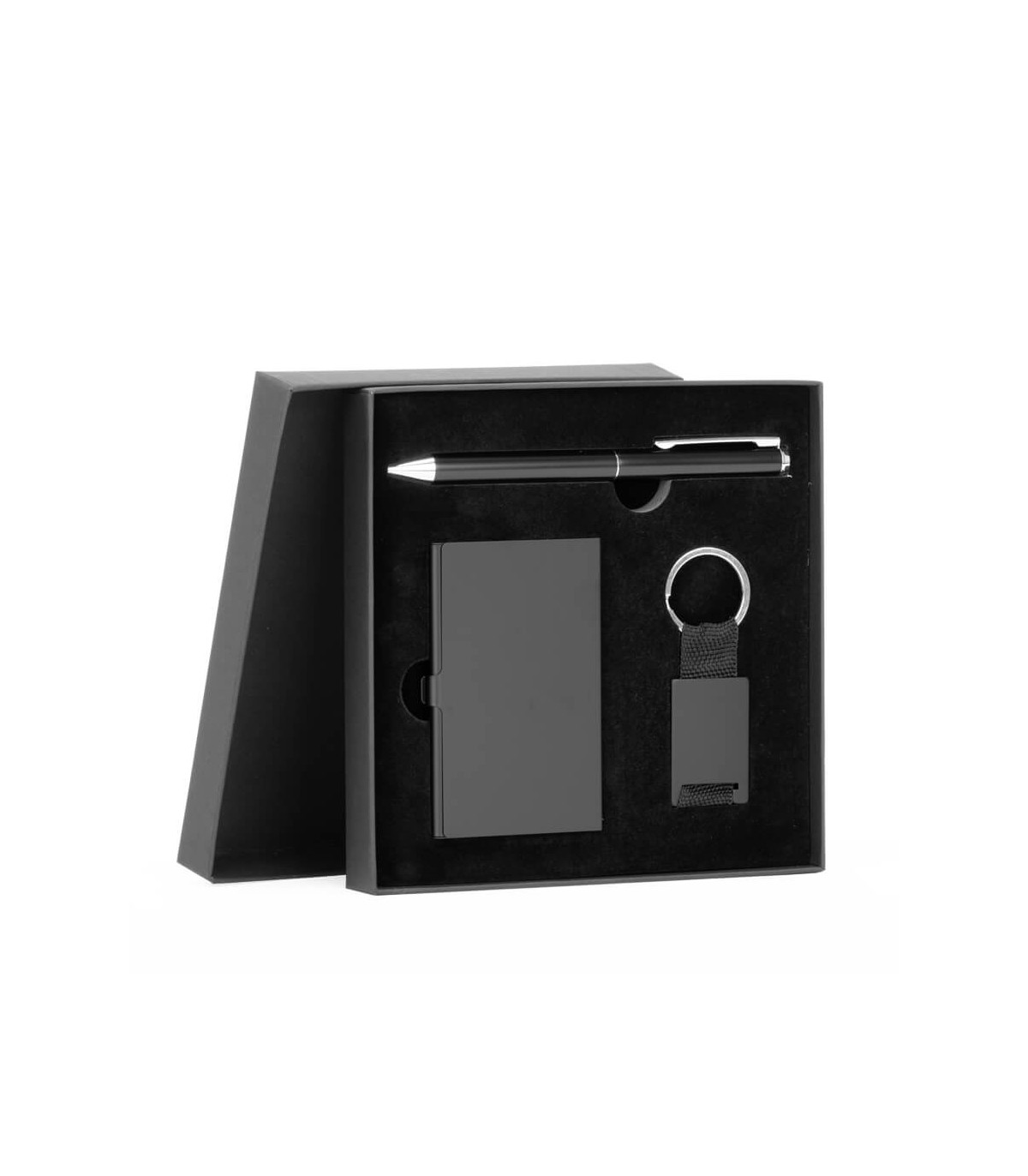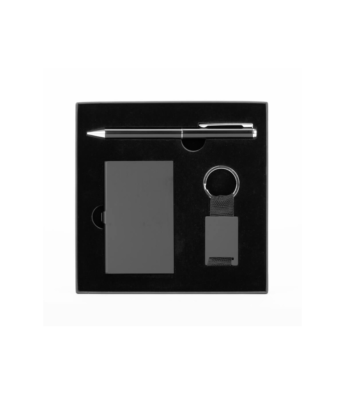 Set de Regalo ejecutivo «ARISTIDE», incluye llavero metálico negro con lanyard de poliéster negro + porta-tarjetas de Aluminio negro + Bolígrafo metálico negro con detalles color plata, escritura negra . Presentación en elegante caja de carton color negro con tapa, interior cuna de EVA aterciopelada negra. Sobre funda de papel negro.Termo-PU, papel..