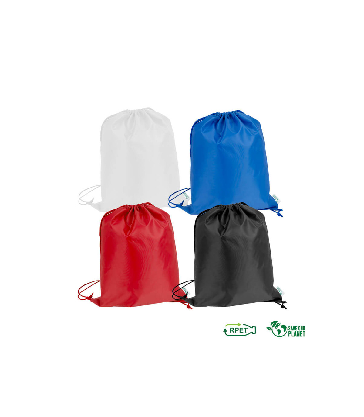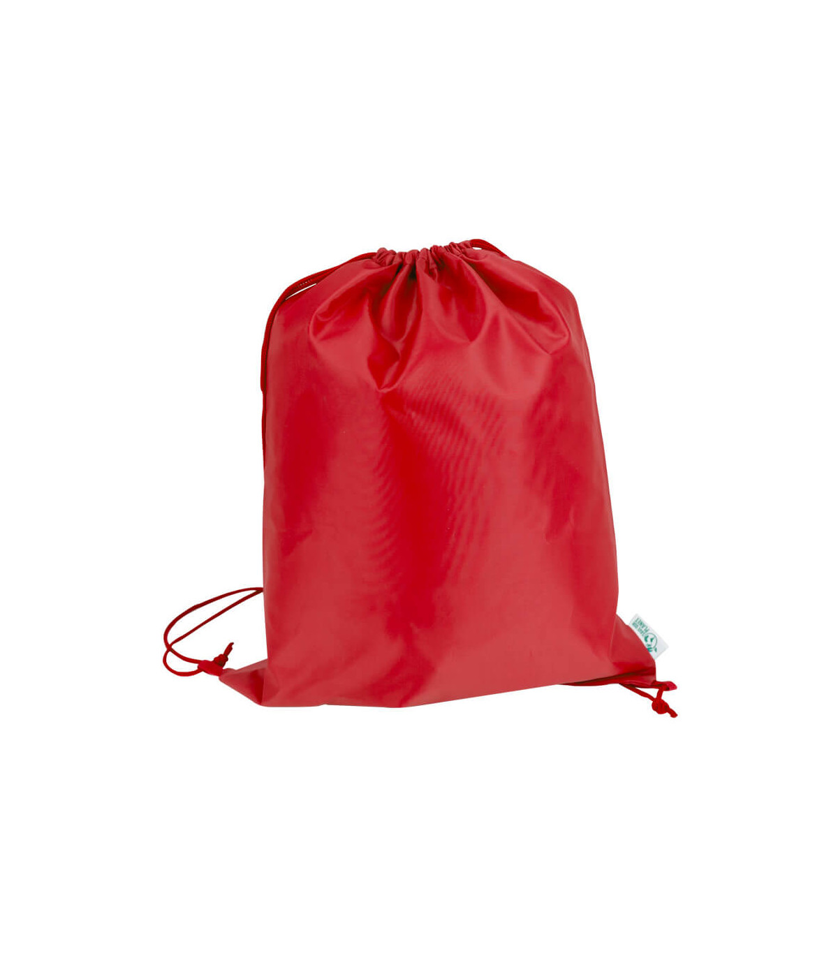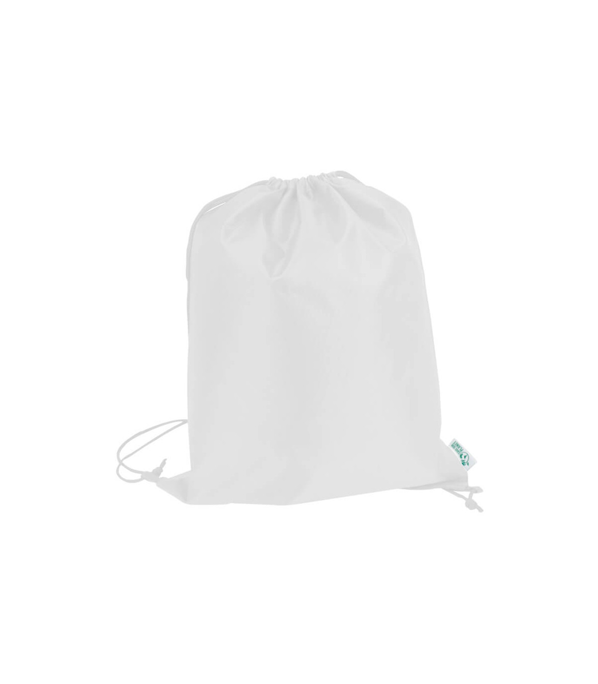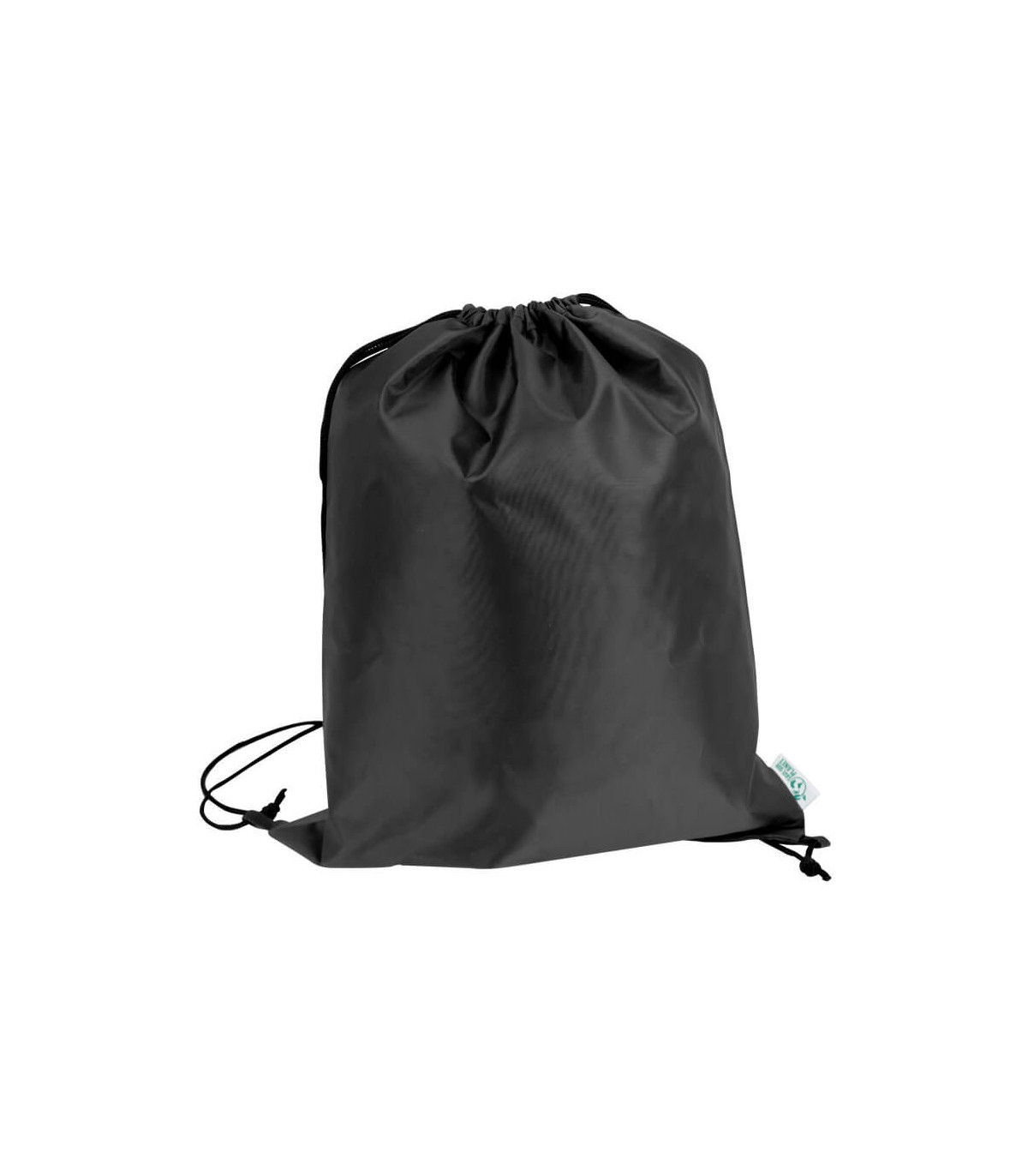 Mochila tipo Morral, fabricada en tela reciclada RPET, con tiras de cordón también el tela reciclada RPET .