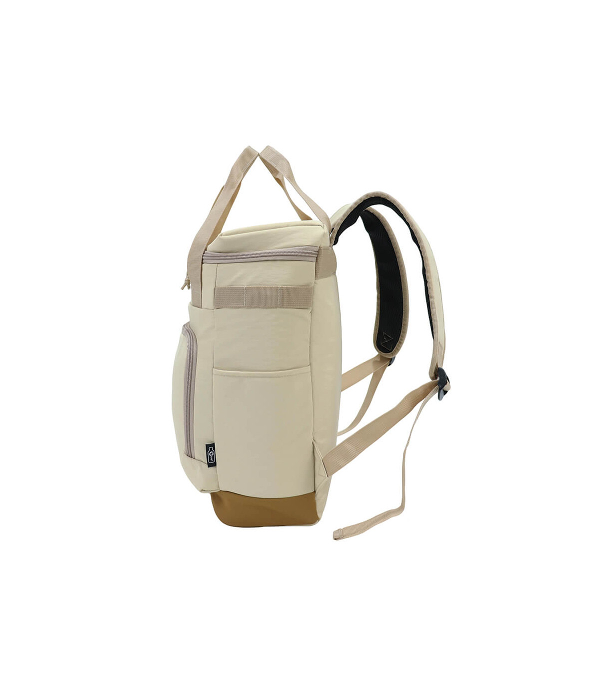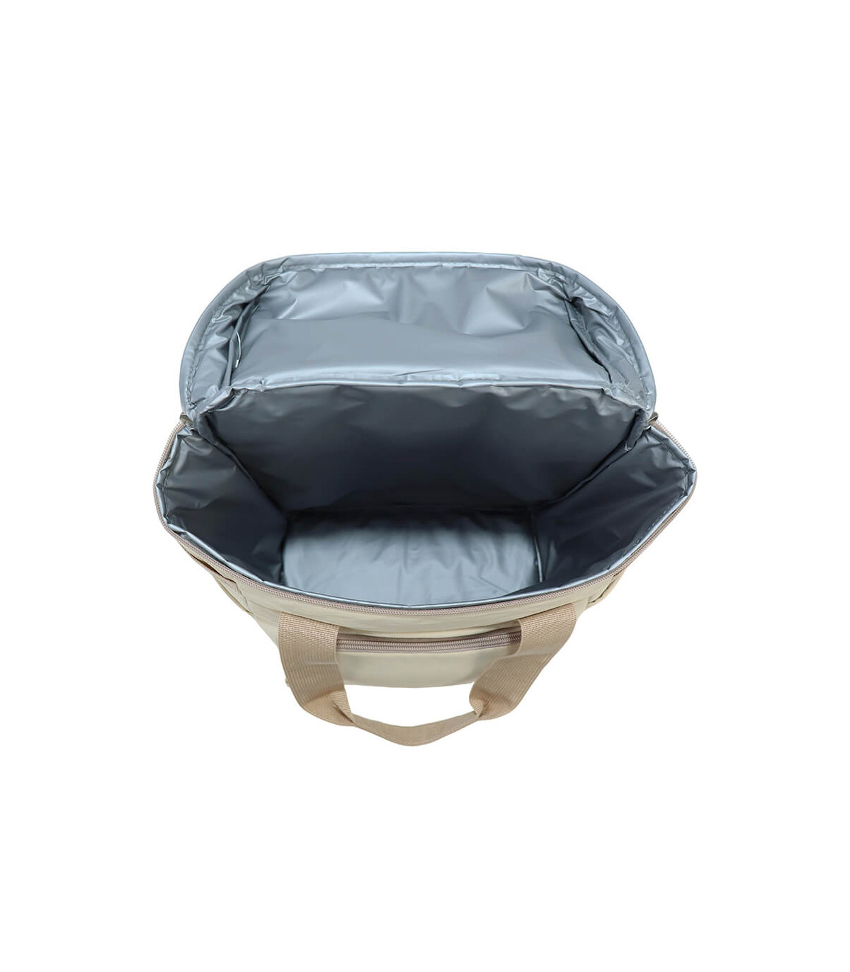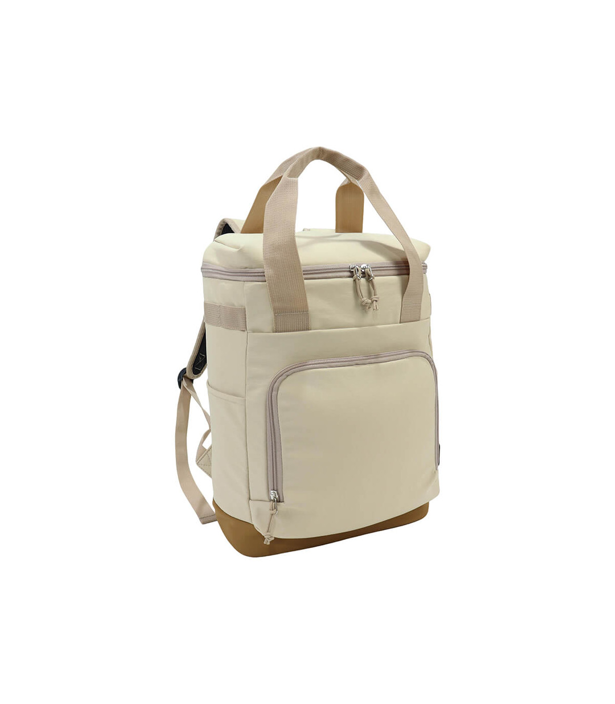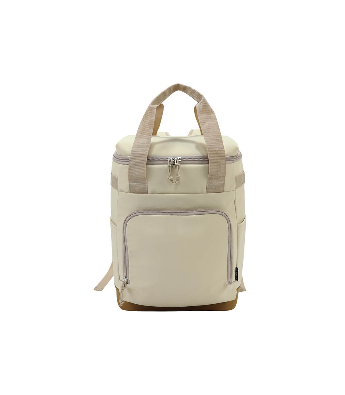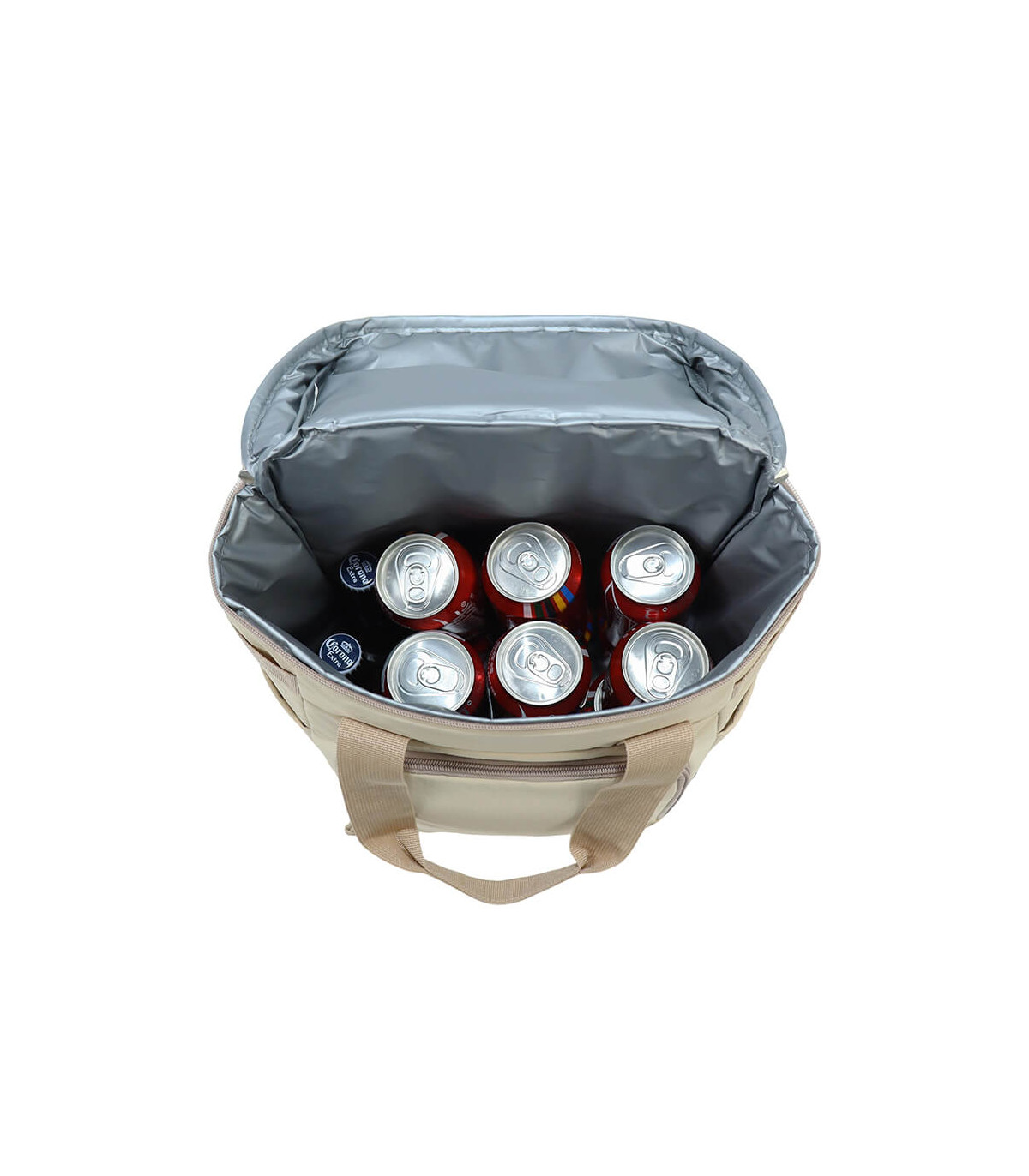 Bolso cooler «ICELAND» con exterior de tela PET reciclada (RPET) color beige e interior térmico aislante de PEVA y acolchado con esponja PE FOAM. Incluye bolsillo delantero, asa larga para colgar al hombro, mango y...