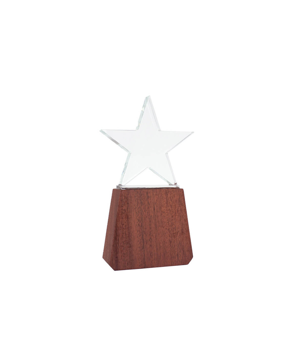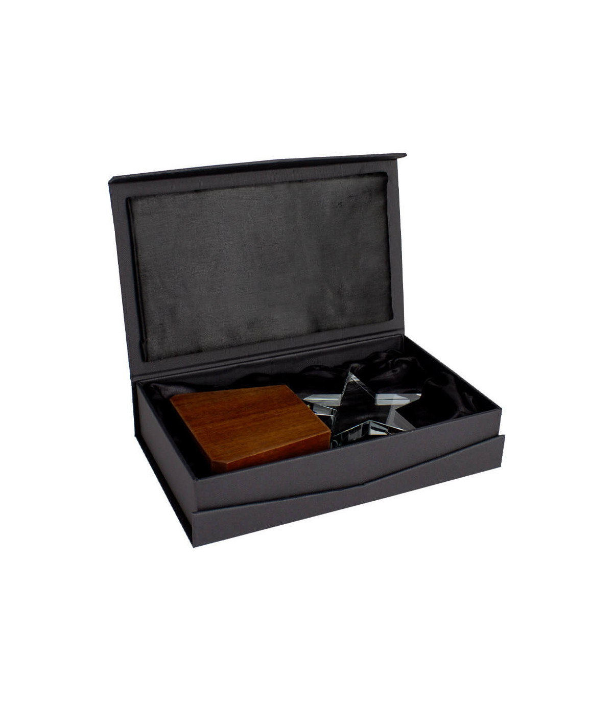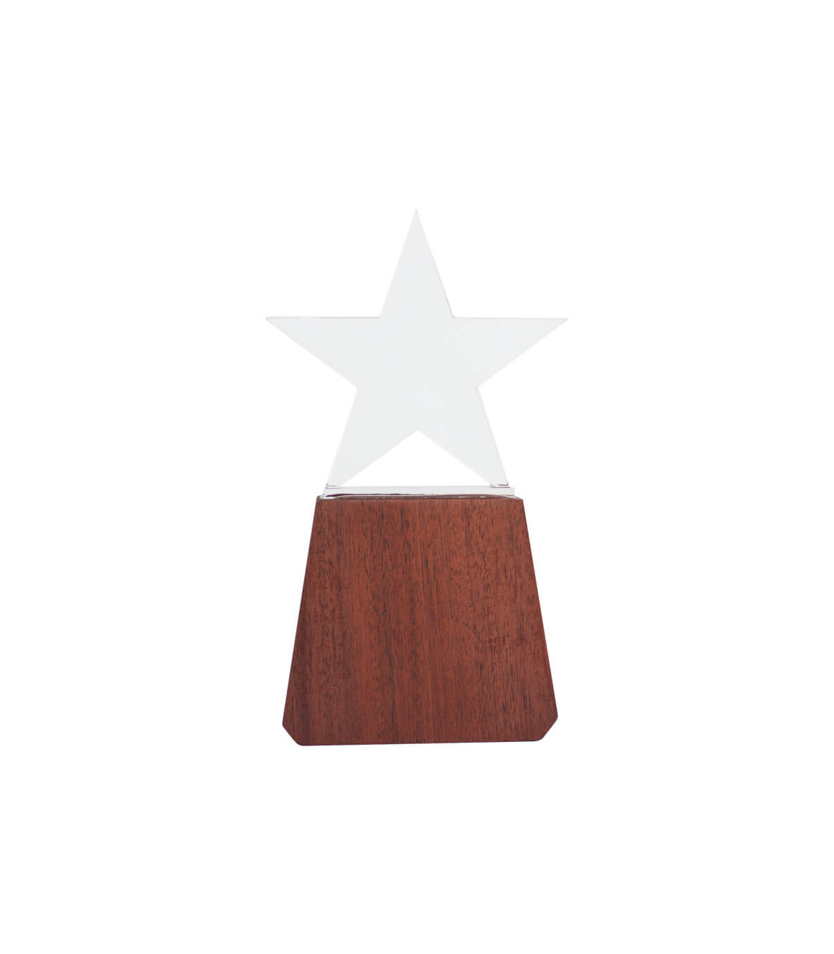 Elegante Trofeo modelo «Lonely Star», base de madera barnizada y estrella de cristal en su parte superior. Presentación en caja de cartón forrado negro con cierre imantado, interior acolchado de espuma y tela poliéster satinado negro, con troquel.