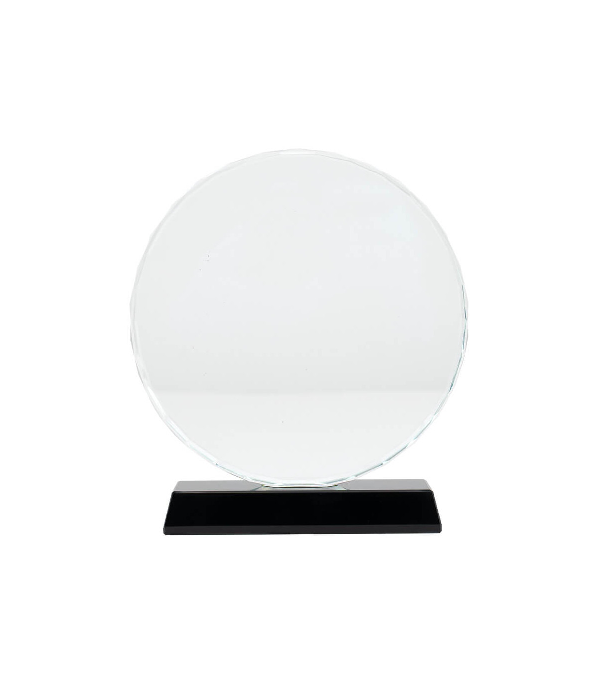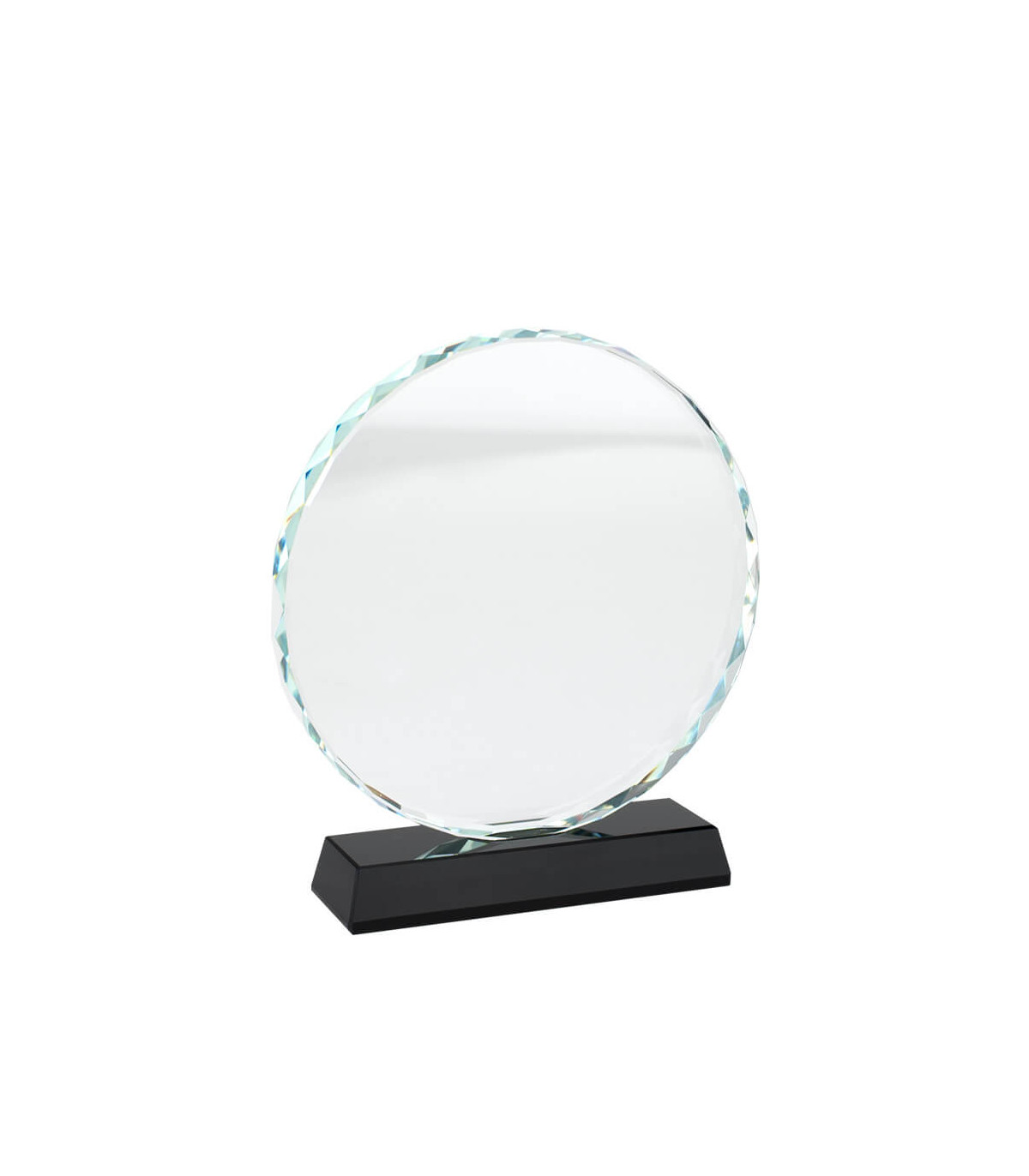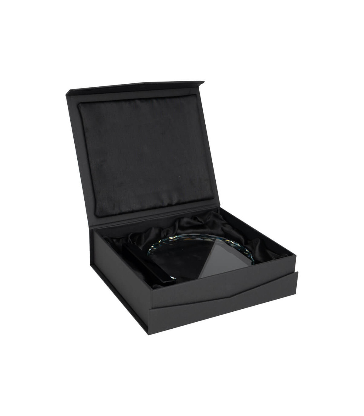 Elegante Trofeo Galvano redondo de Cristal modelo «Prisma», con base de cristal negro. Presentación en caja de cartón forrado negro con cierre imantado, interior acolchado de espuma y tela poliéster satinado negro, con troquel.