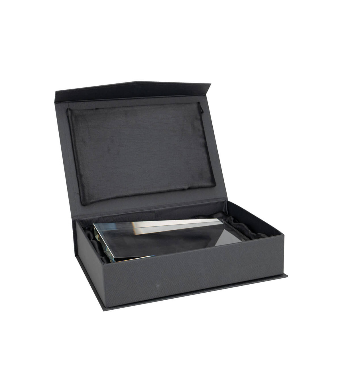 Elegante Trofeo Galvano de Cristal modelo «Tear», con base de cristal negro. Presentación en caja de cartón forrado negro con cierre imantado, interior acolchado de espuma y tela poliéster satinado negro, con...