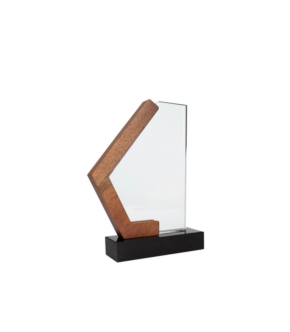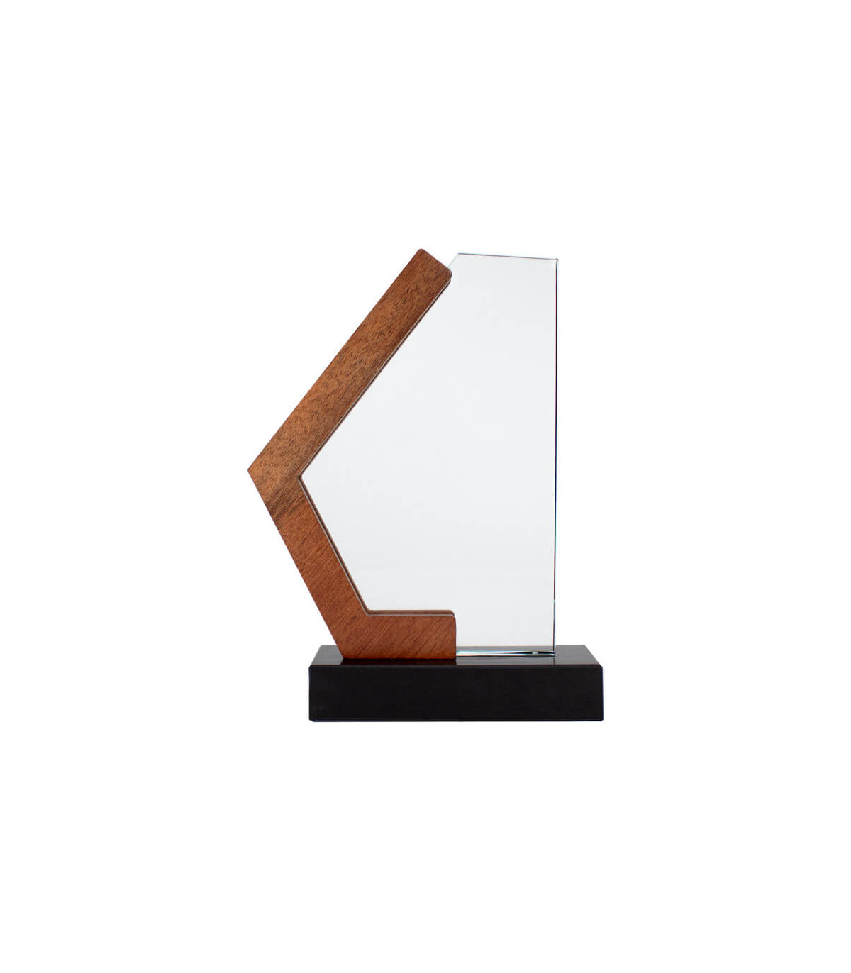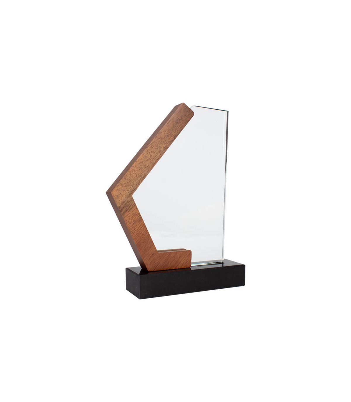 Elegante Trofeo modelo «Mercx», en madera barnizada y cristal, con base de mármol negro. Presentación en caja de cartón forrado negro con cierre imantado, interior acolchado de espuma y tela poliéster satinado negro, con troquel.