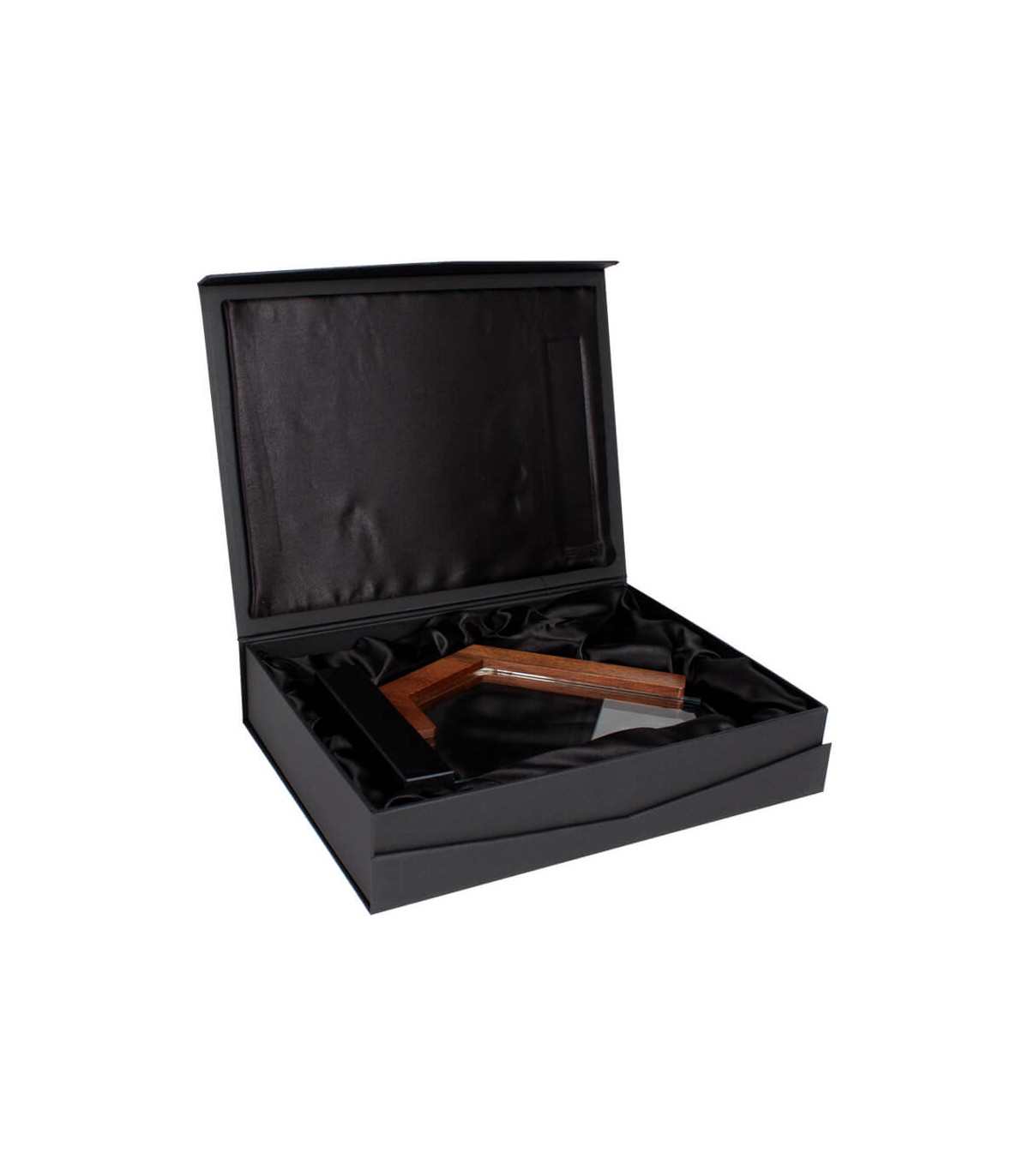 Elegante Trofeo modelo «Lewis», en madera barnizada y cristal. Presentación en caja de cartón forrado negro con cierre imantado, interior acolchado de espuma y tela poliéster satinado negro, con troquel.