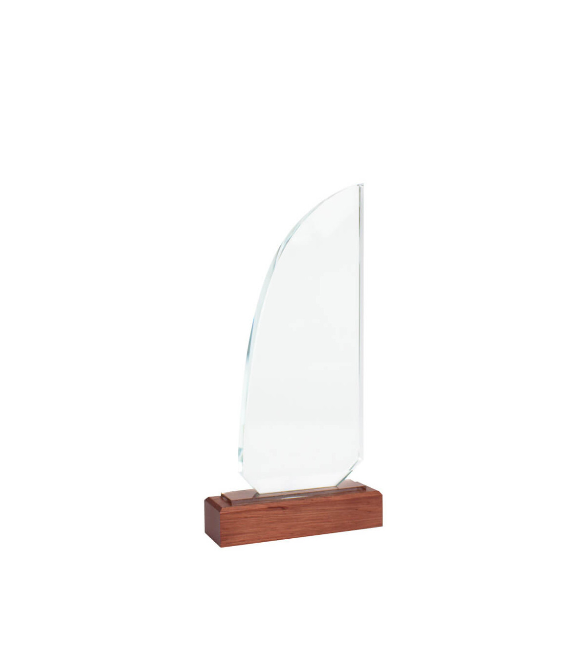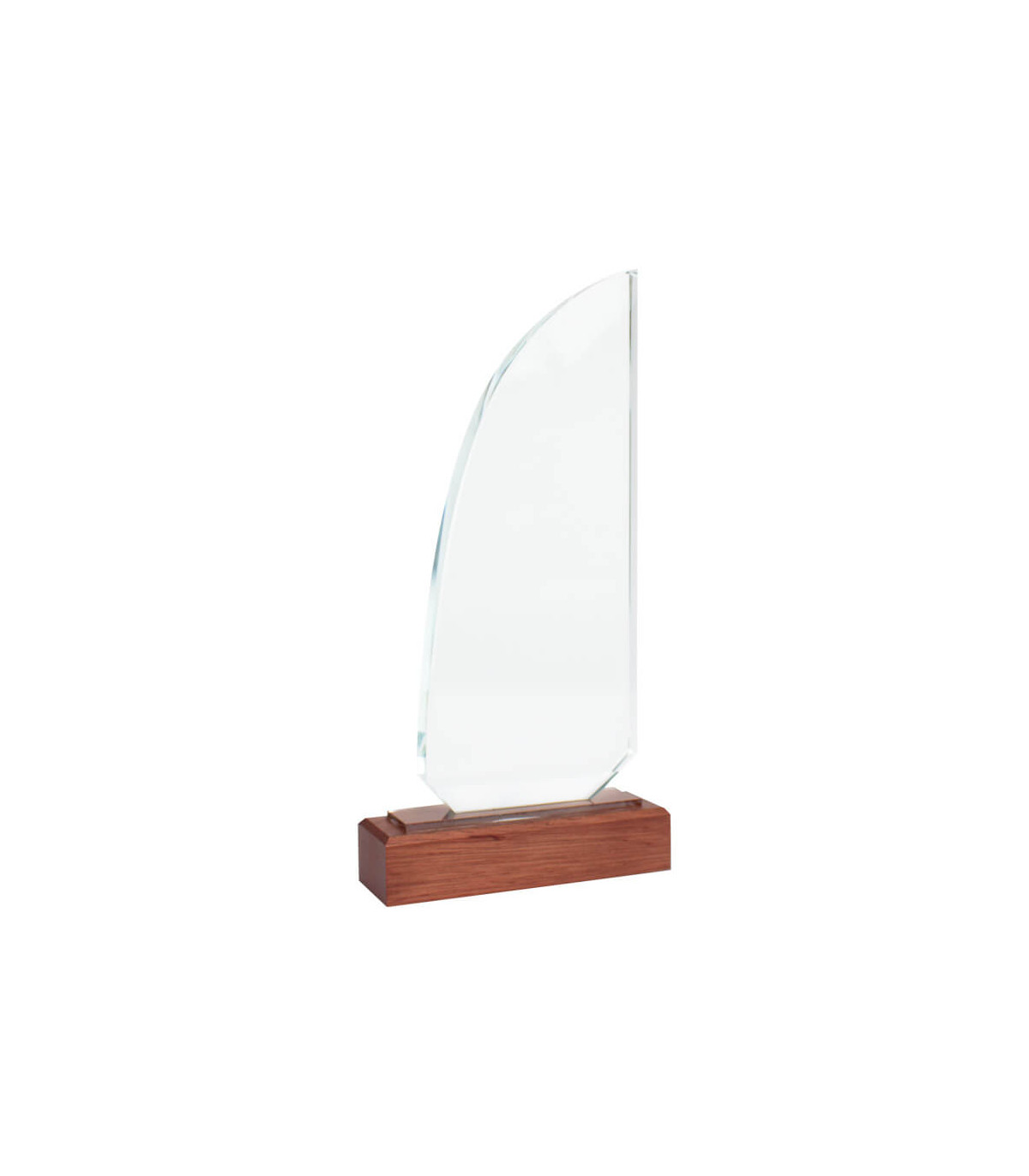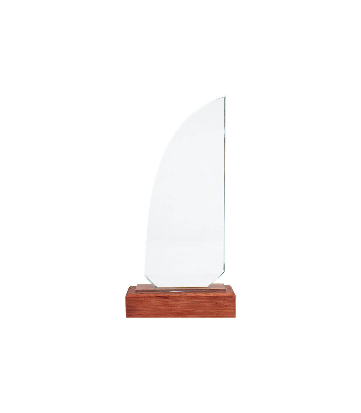 Elegante Trofeo modelo «Sail», base de madera barnizada y cuerpo de cristal con forma de vela. Presentación en caja de cartón forrado negro con cierre imantado, interior acolchado de espuma y tela poliéster satinado negro, con troquel.
