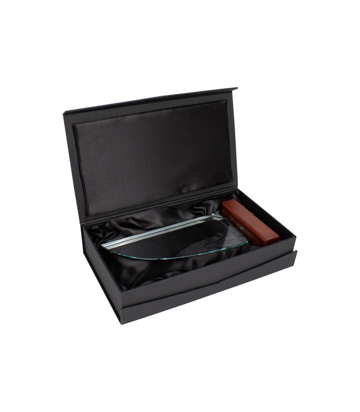 Elegante Trofeo Galvano de Cristal modelo «Syntec». Presentación en caja de cartón forrado negro con cierre imantado, interior acolchado de espuma y tela poliéster satinado negro, con troquel.