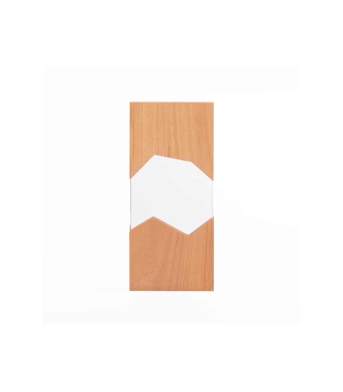 Placa metálica color cobre, modelo «BLOCK», montada sobre base rectangular de madera enchapada con esquinas redondeadas. En su parte posterior, incluye orificios y soporte metálico para exhibición vertical u...