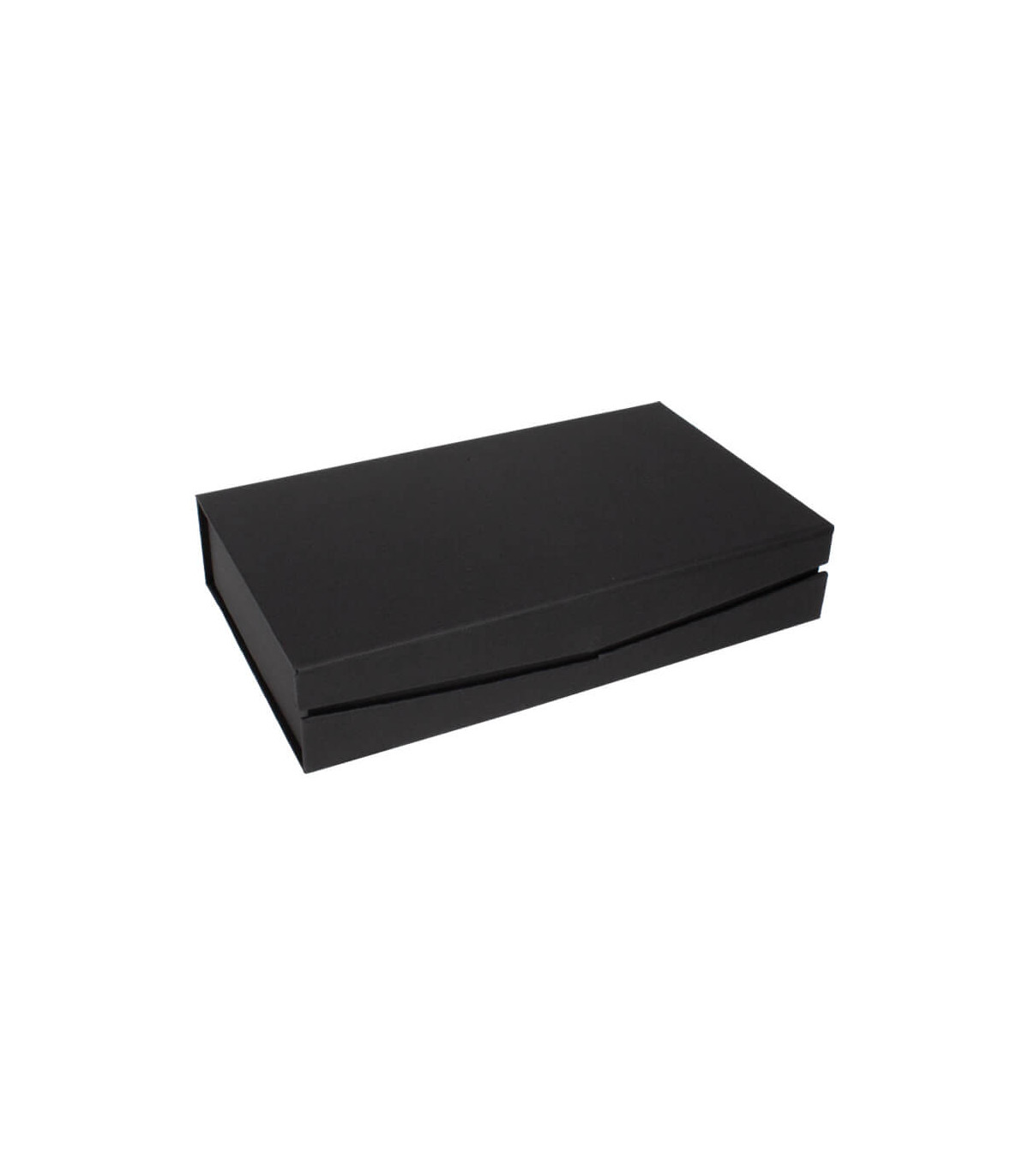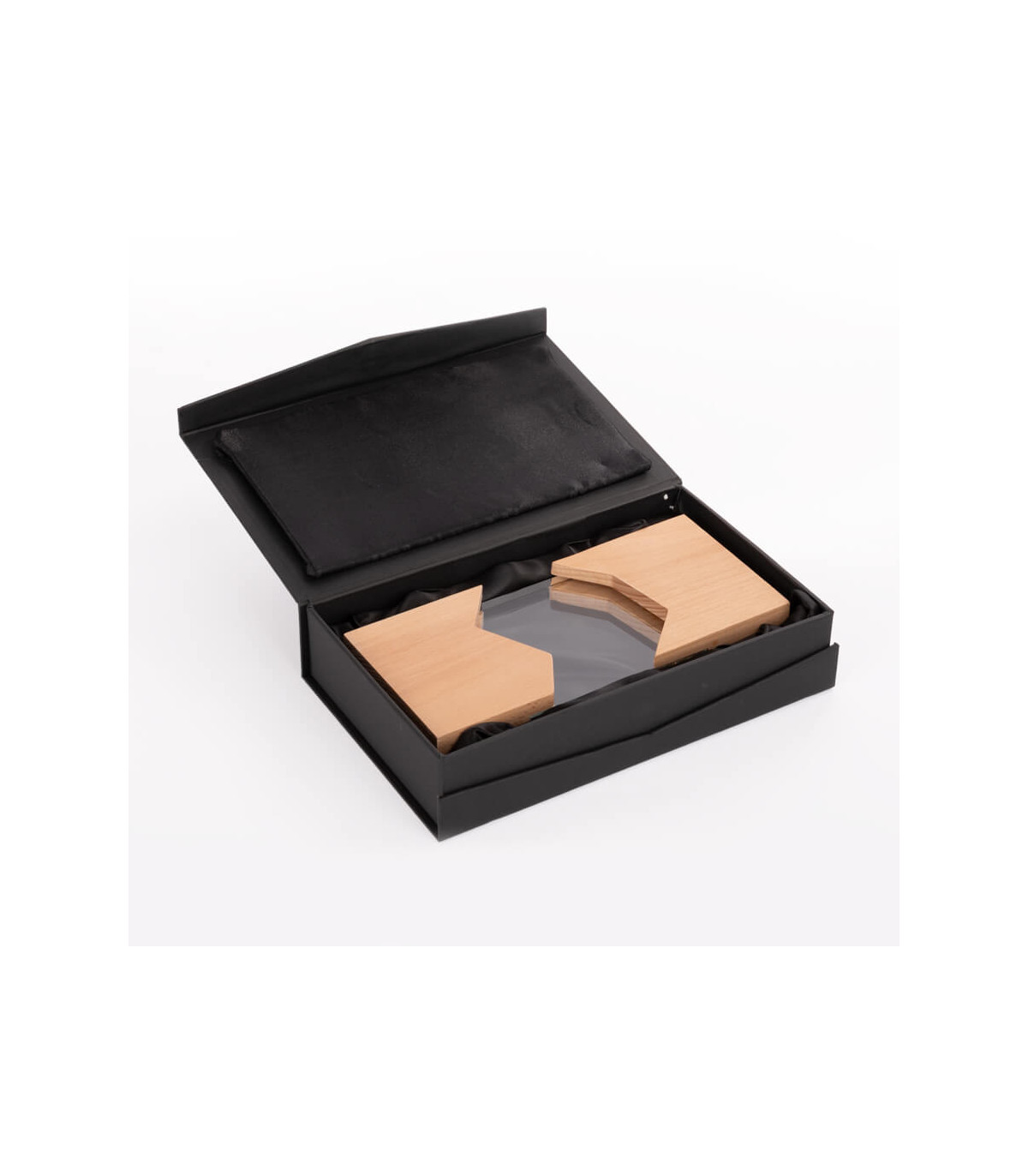 •Presentación: Caja de cartón forrado negro con cierre imantado, interior acolchado de espuma y tela poliéster satinado negro, con troquel.