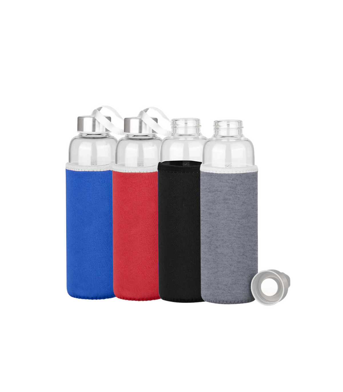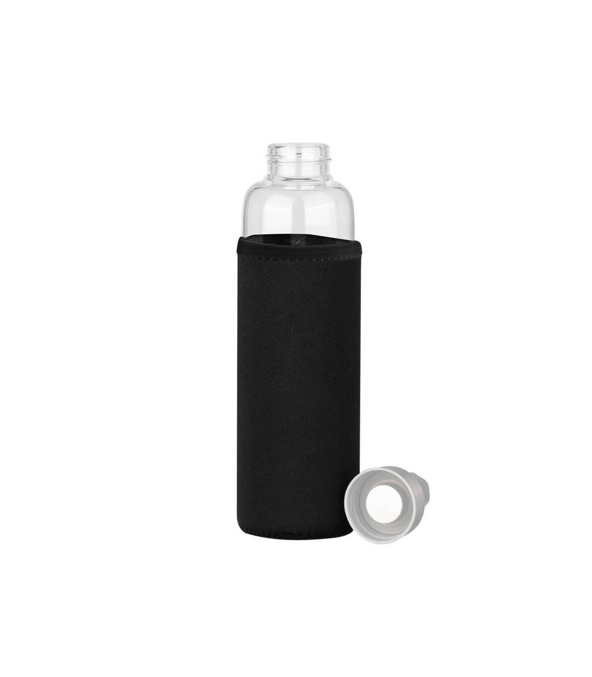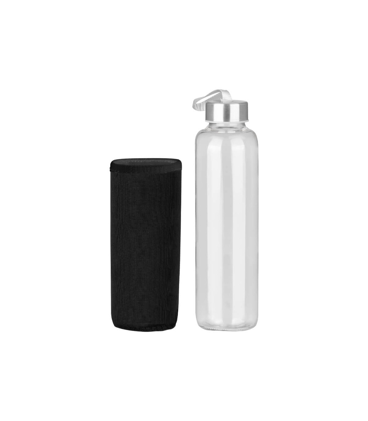Botella cilíndrica de Borosilicato de alta resistencia. Incluye tapa rosca de Acero inoxidable y cinta lanyard colgante de polipropileno (PP) color plata en su parte superior. Cuenta con una práctica funda removible de tela Neopreno aislante en colores, para una mayor protección contra golpes y temperatura . Producto BPA FREE, para el contacto con todo tipo de líquidos. Capacidad 580ml. Apta para Lavavajillas (sin funda) y para Horno Microondas.