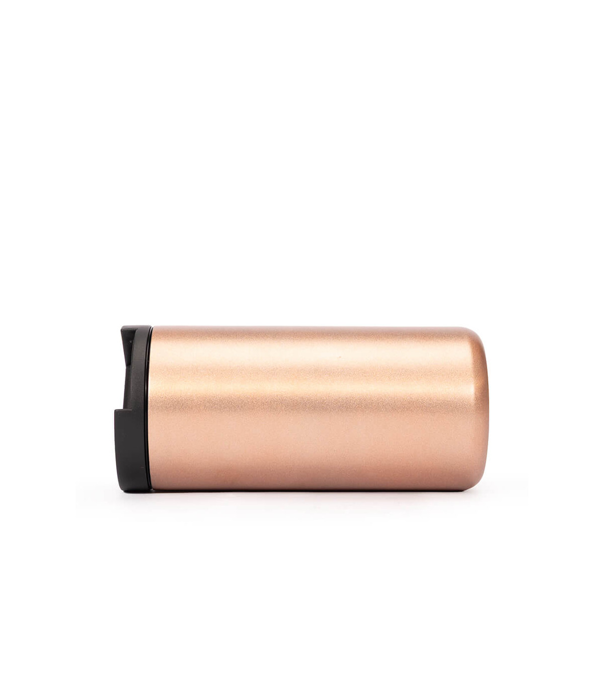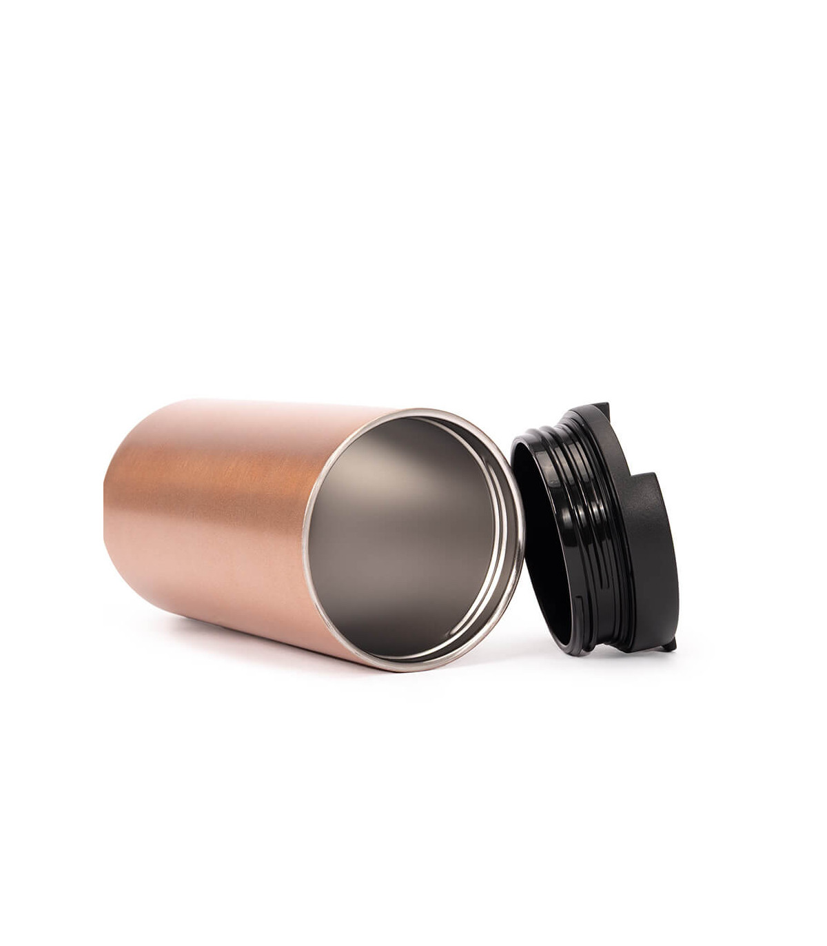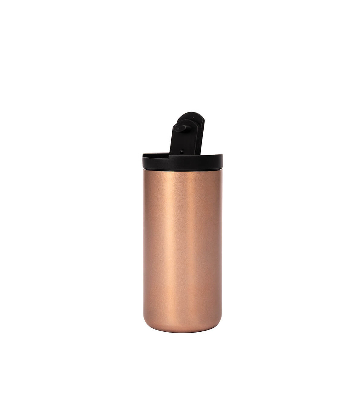 Mug metálico cilíndrico con doble pared aislante, interior Acero inoxidable 304 SS, exterior Acero inoxidable 201 SS, recubierto con pintura POWDER COAT color cobre. Producto BPA FREE, para el contacto con líquidos y alimentos. Fondo de silicona negra ABS anti-deslizante. Con tapa pull-up de plástico ABS negro y dosificador con sello cilíndrico de silicona. Capacidad 500ml. Presentación en bolsa compostable blanca + caja de regalo de cartón negro.