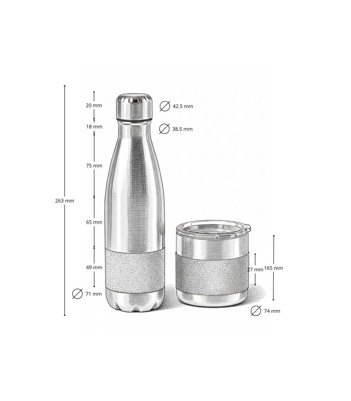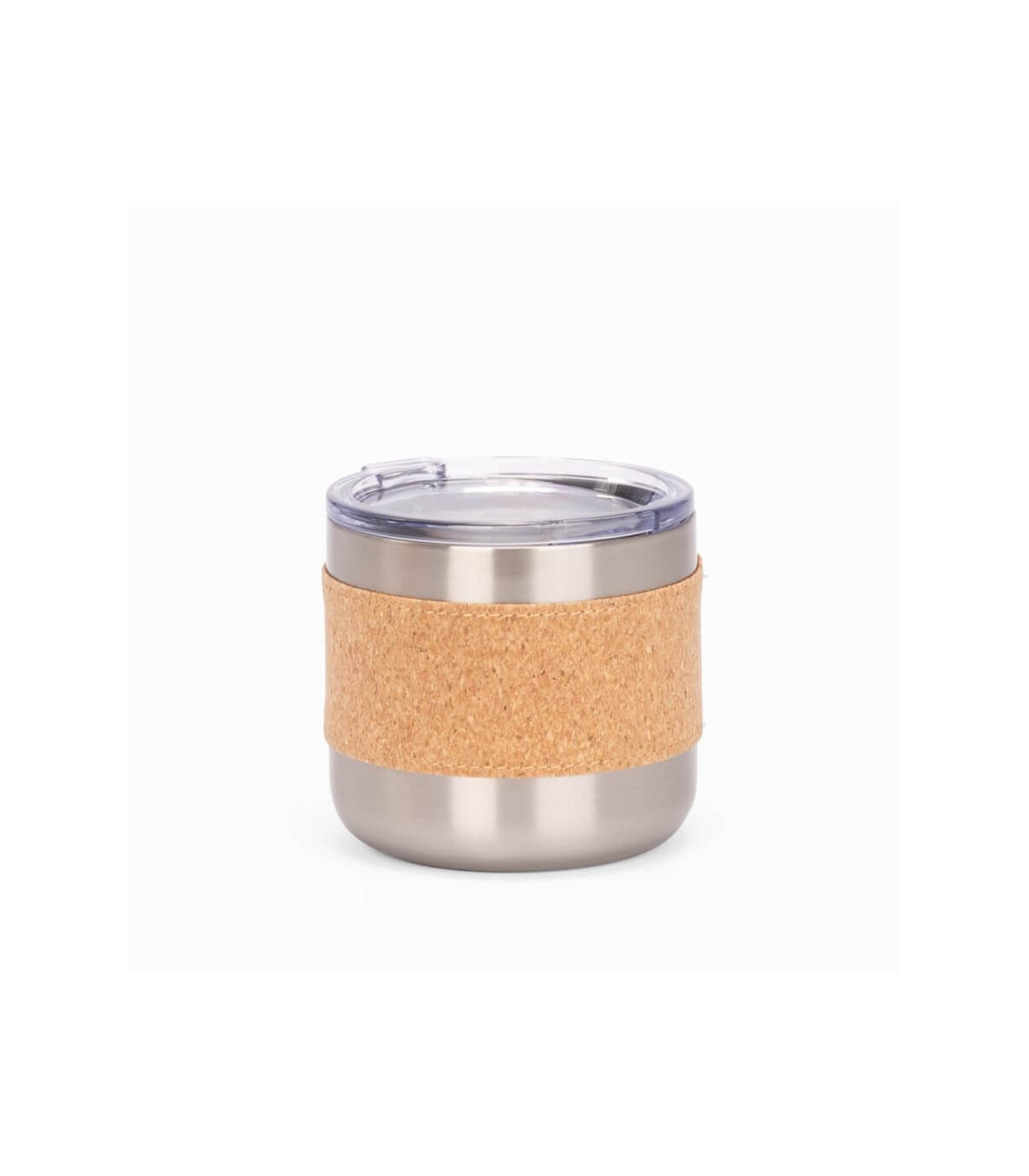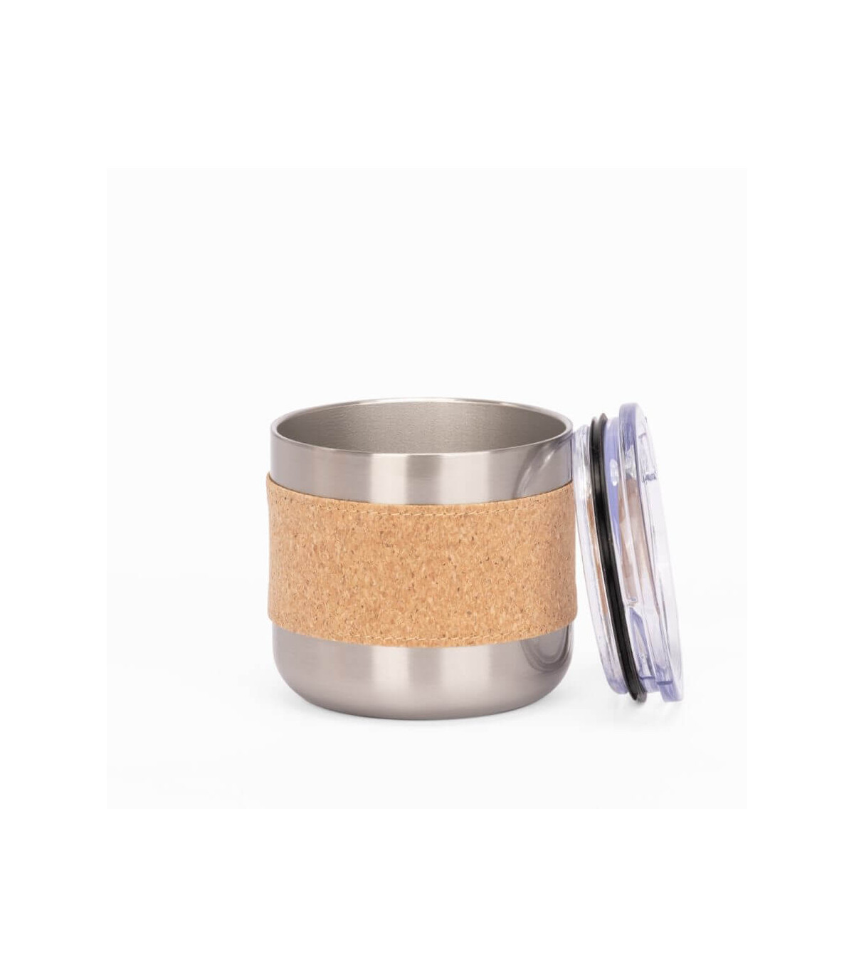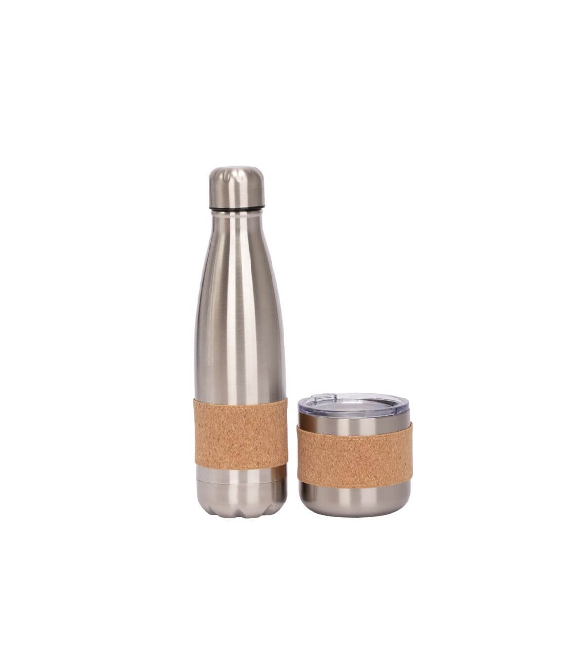 NARA es un set ecológico compuesto por una botella térmica y un mug a juego, ambos fabricados en acero inoxidable con detalles en corcho natural. Esta combinación elegante y funcional está pensada para acompañarte tanto en movimiento como en pausa. La botella mantiene tus bebidas a la temperatura ideal gracias a su doble pared aislante, mientras que el mug, también térmico, incluye una tapa transparente que permite disfrutar con comodidad sin perder calor. NARA es una opción perfecta para marcas que desean proyectar armonía, utilidad y respeto por el entorno en un solo regalo.
