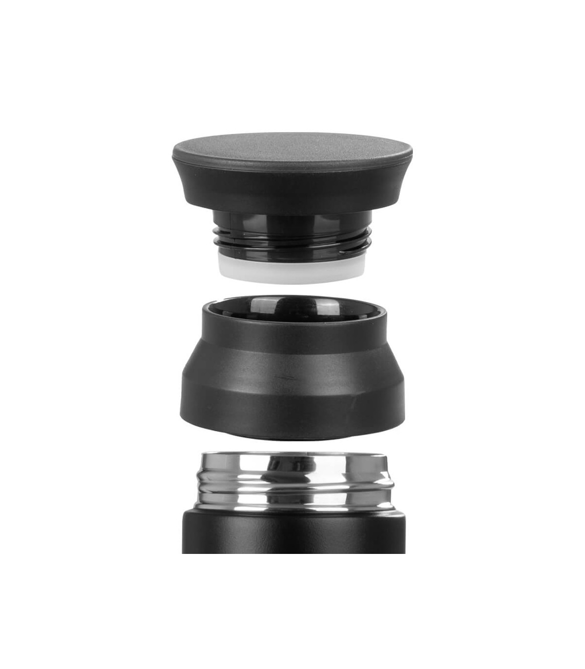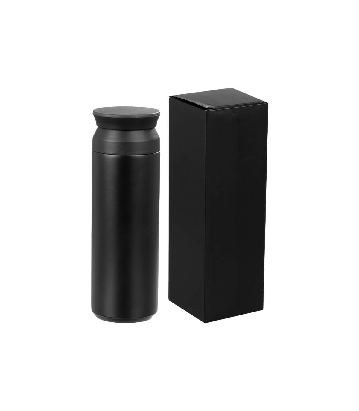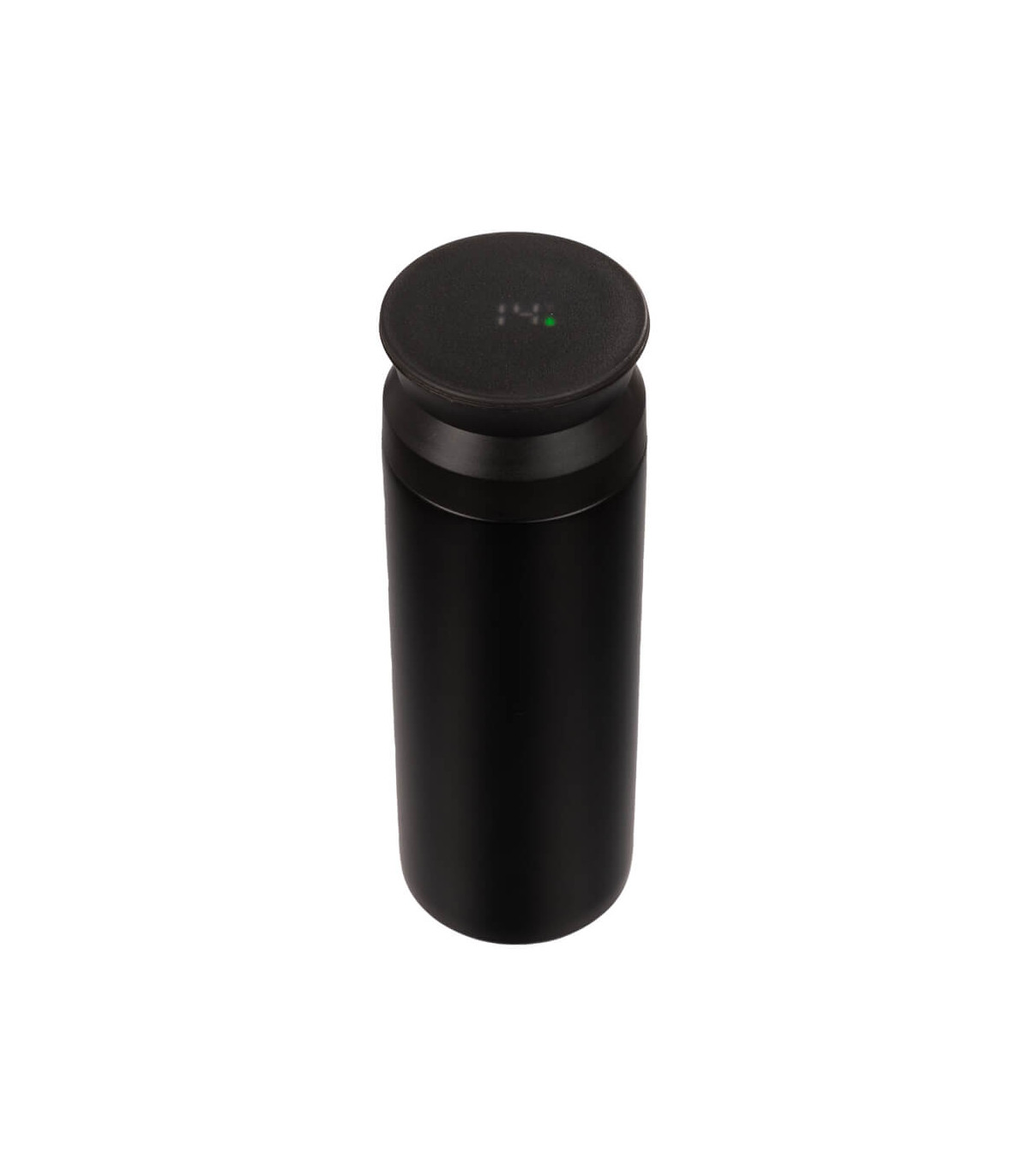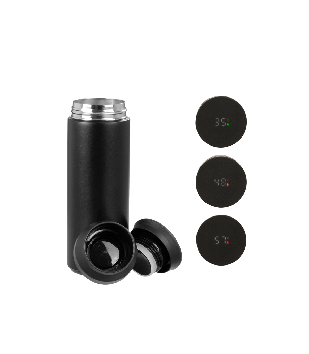 Botella térmica metálica doble pared aislante, cubierta de Polipropileno (PP) acabado mate, interior Acero inoxidable 304 SS, exterior Acero inoxidable 201 SS, modelo «SMART LID». Incluye doble tapa rosca de plástico PP negro, con sello cilíndrico de silicona, sistema de filtro circular y termómetro digital en la tapa superior, que marca la temperatura del líquido interior. Capacidad 480ml. Producto BPA FREE, para el contacto con líquidos y alimentos. Presentación en bolsa plástica transparente + caja de regalo de cartón laminado negro.