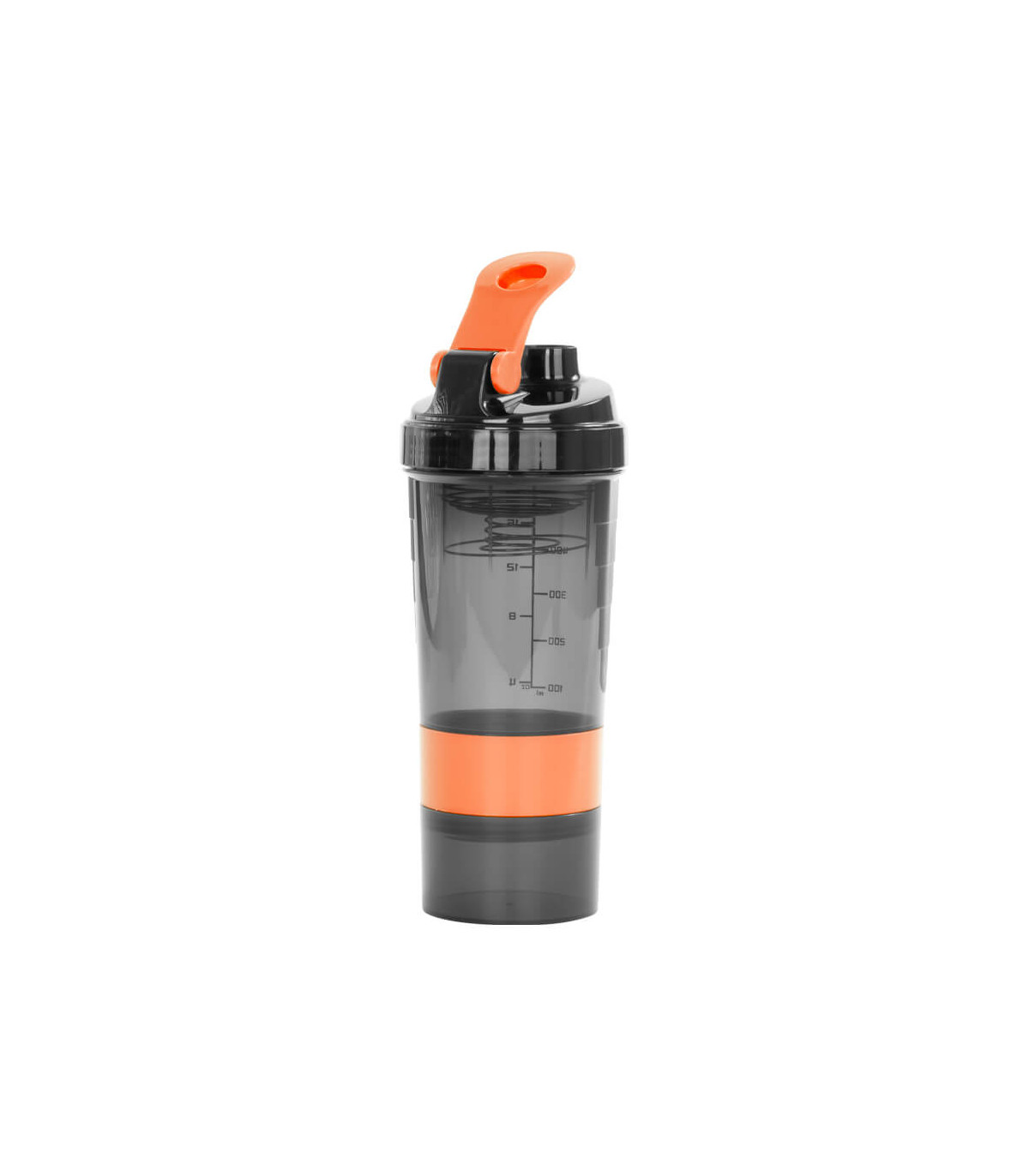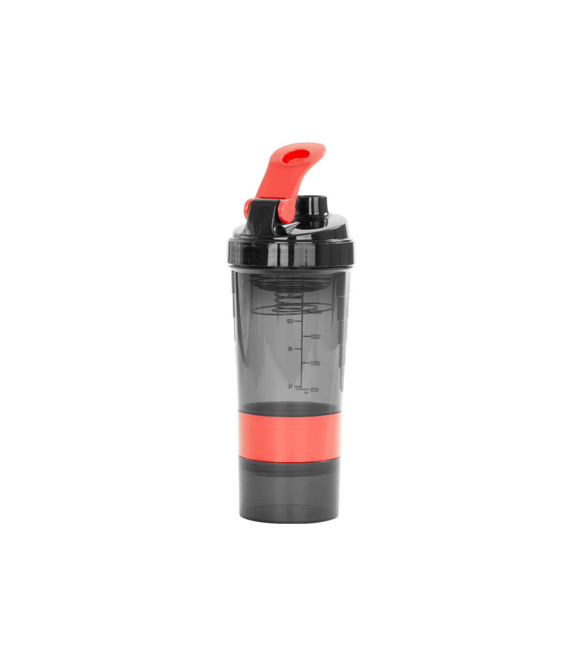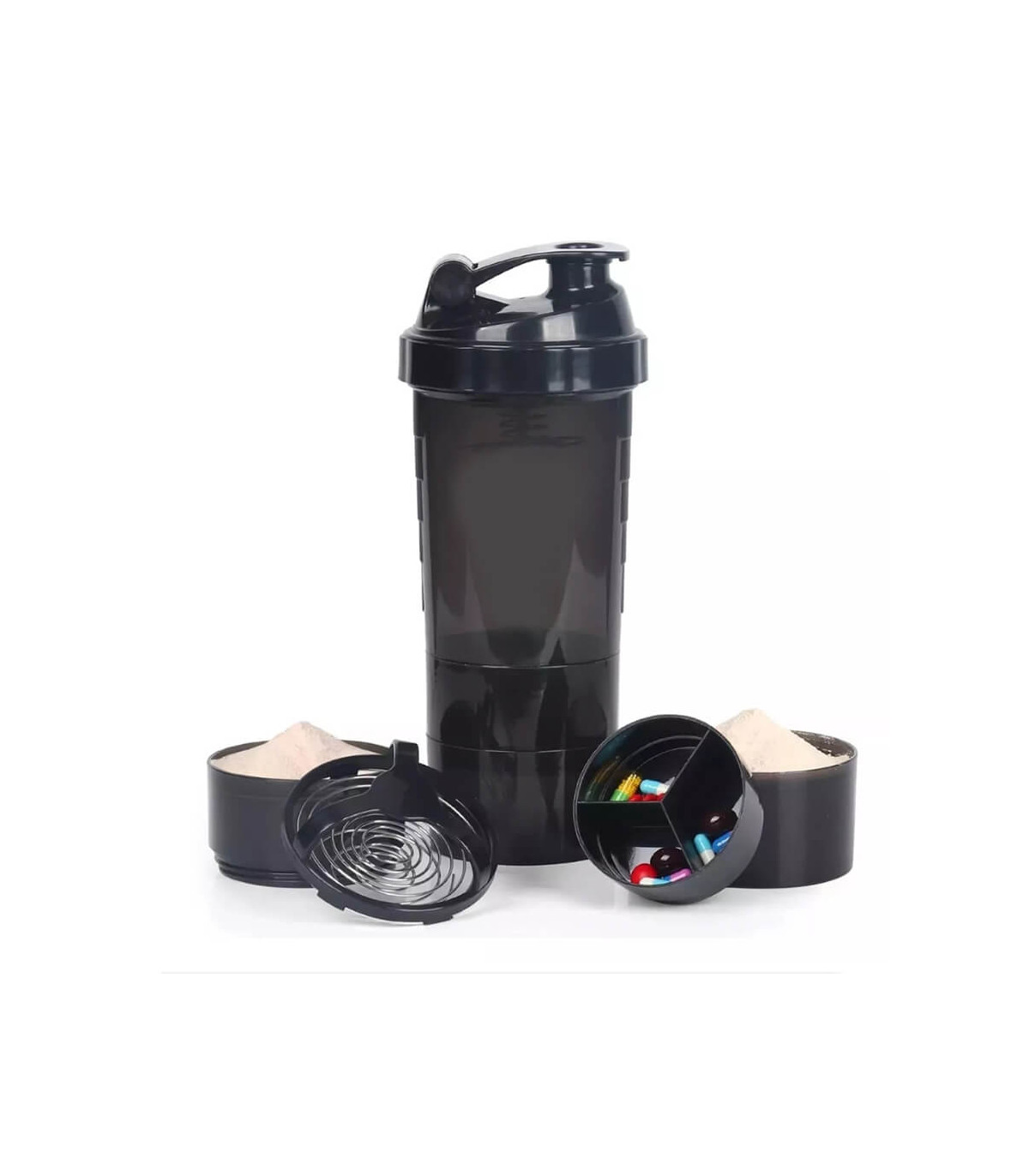 Este es el vaso shaker más completo del mercado, que no puede faltar en tu visita al gym o tus salidas al aire libre, deportes o entrenamientos. Vaso plástico Gym para batidos proteína «SHAKE». Contiene 4 compartimentos, el superior para líquidos, y los 2 de abajo para polvos, proteínas, etc. Además, contiene un cuarto compartimento con 3 divisiones, ideal para guardar píldoras u optros accesorios pequeños. Boquilla superior con tapa. En su parte superior interior, contiene espiral de acero inoxidable, para evitar el pegado del polvo a las paredes del vaso.
