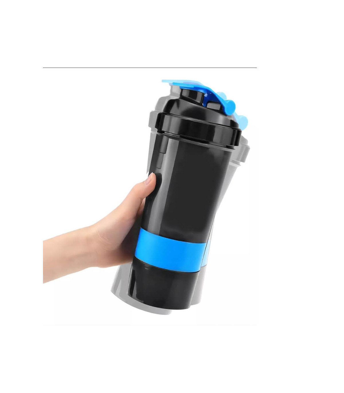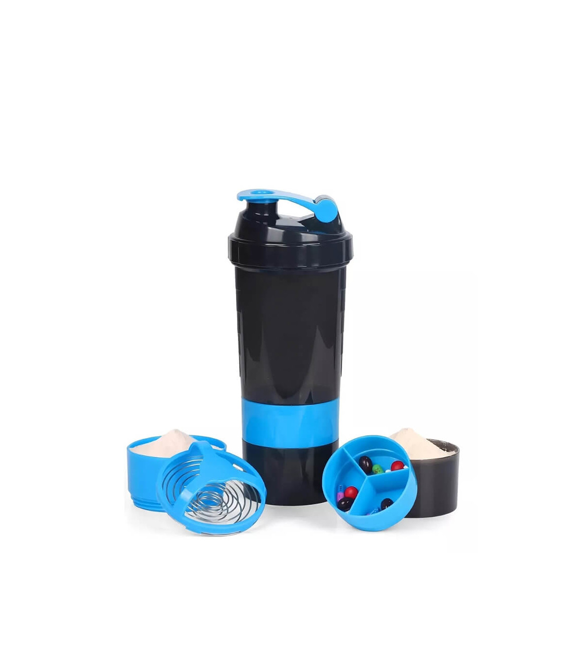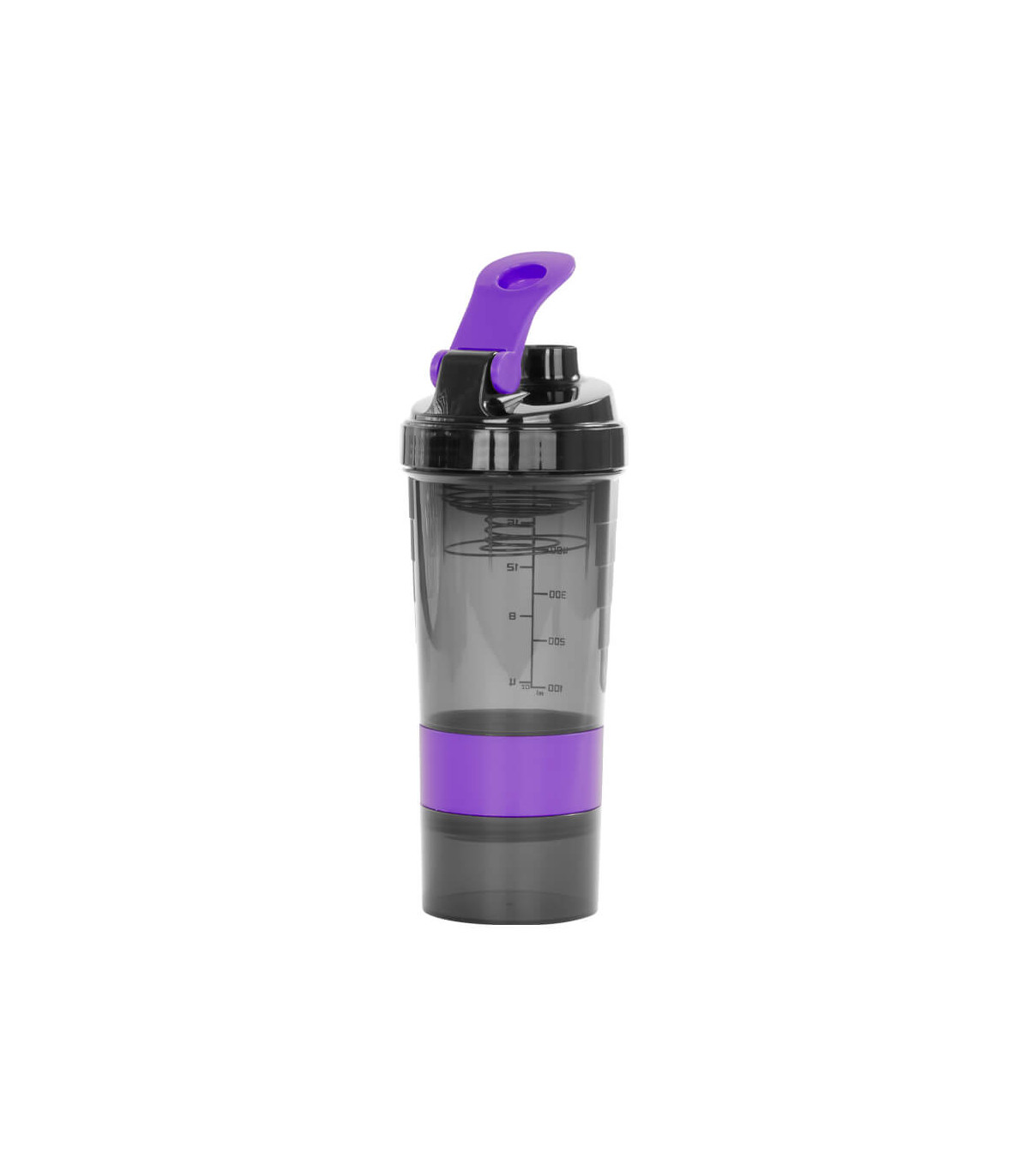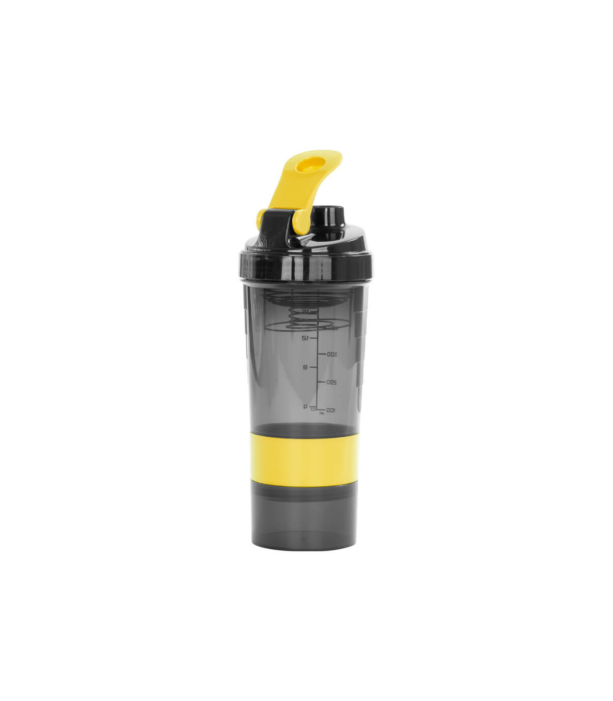 Este es el vaso shaker más completo del mercado, que no puede faltar en tu visita al gym o tus salidas al aire libre, deportes o entrenamientos. Vaso plástico Gym para batidos proteína «SHAKE». Contiene 4 compartimentos, el superior para líquidos, y los 2 de abajo para polvos, proteínas, etc. Además, contiene un cuarto compartimento con 3 divisiones, ideal para guardar píldoras u optros accesorios pequeños. Boquilla superior con tapa. En su parte superior interior, contiene espiral de acero inoxidable, para evitar el pegado del polvo a las paredes del vaso.