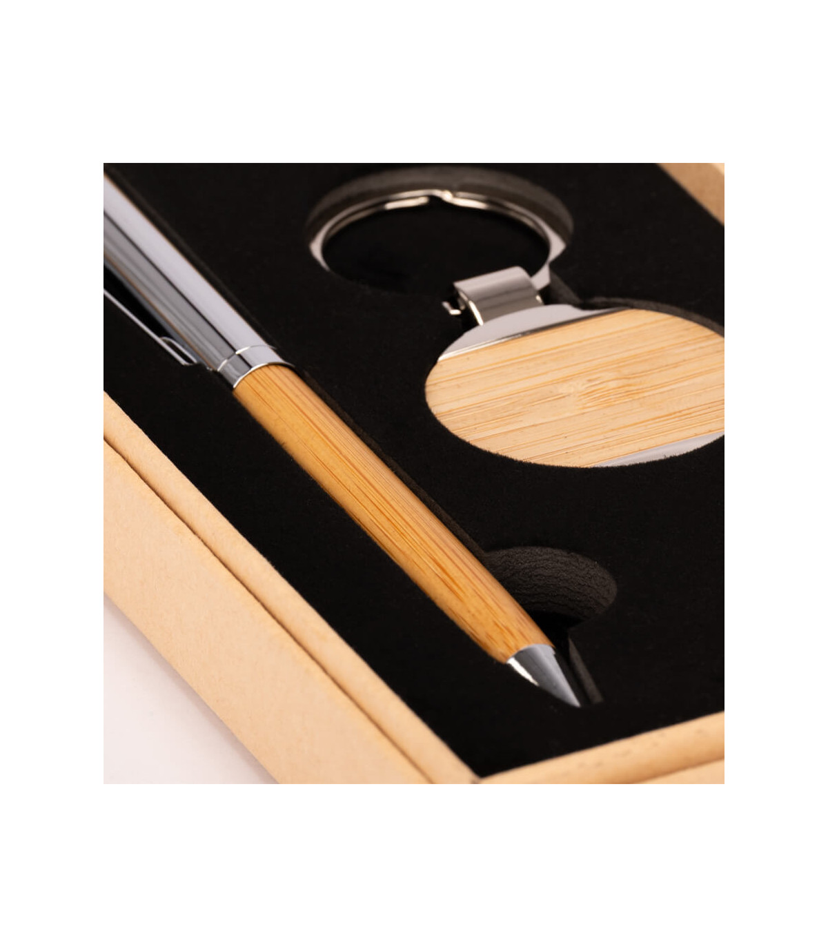 Set de Regalo «UMPIRE», incluye llavero metálico CON APLICACIÓN DE bAMBOO + Bolígrafo metálico plateado con grip de Bamboo, escritura azul. Presentación en elegante caja de carton color natural con tapa, interior cuna de EVA aterciopelada negra. Sobre funda de papel color natural.