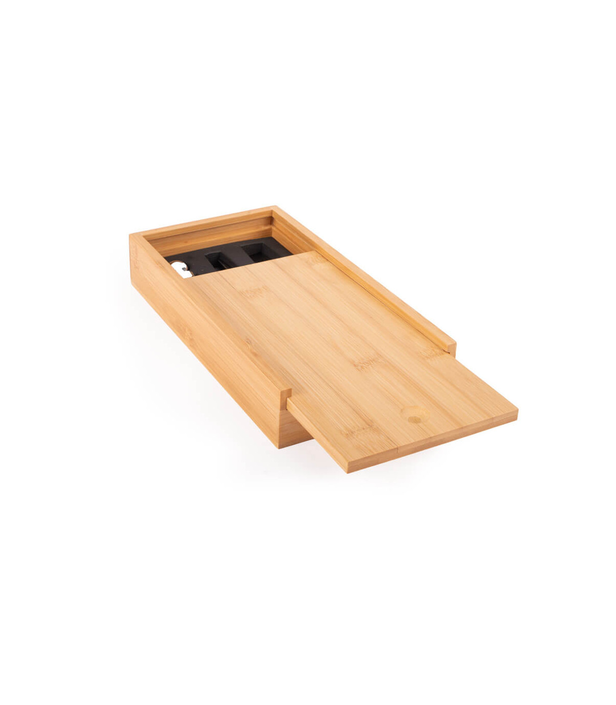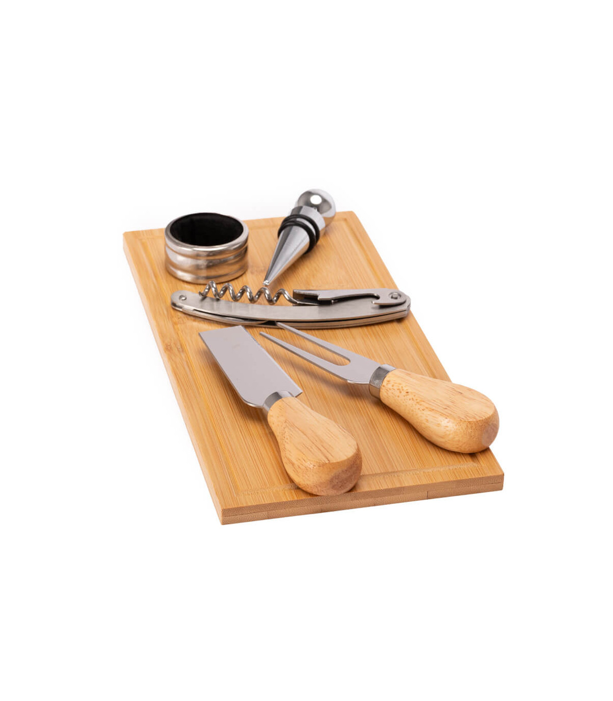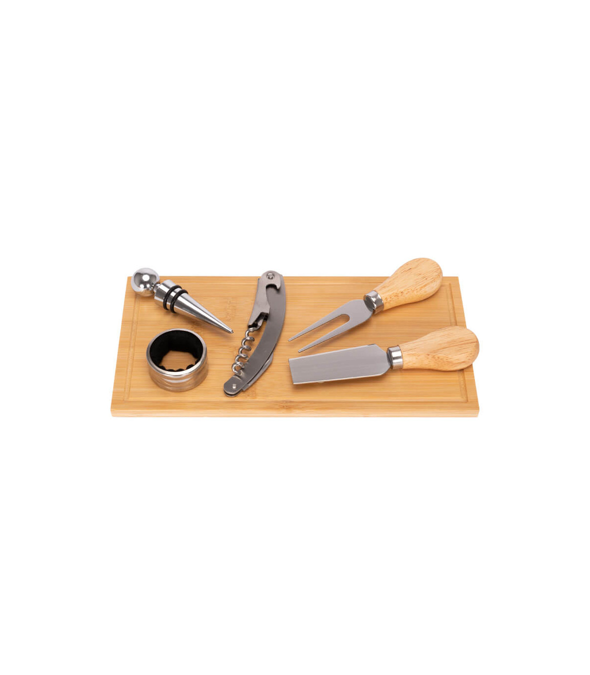 Set de accesorios para Vino y Quesos «FUTRONO» 6-en-1, con tapa deslizable de bamboo, que sirve también como tabla para alimentos por el reverso. Contiene: tapa/tabla de 24.1 x 10.8 x 0.8 cm con calado en el contorno, para evitar derrame de líquidos, destapador / saca-corchos de acero inoxidable, tapón para botella de vino de acero inoxidable, anillo corta-gotas de zinc y nonwoven, tenedor y cuchillo para quesos de acero inoxidable y mango de bamboo.