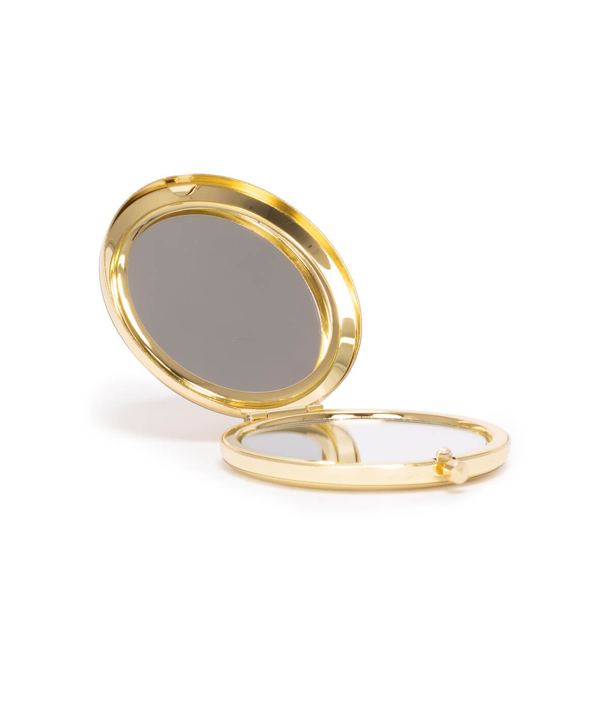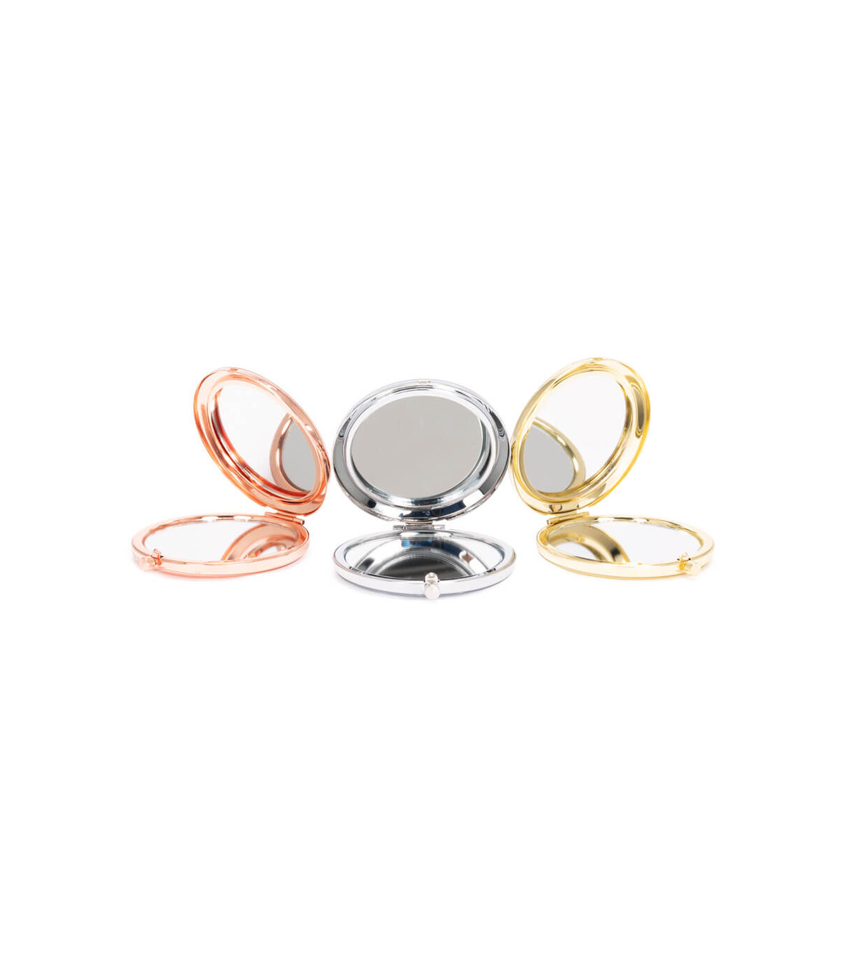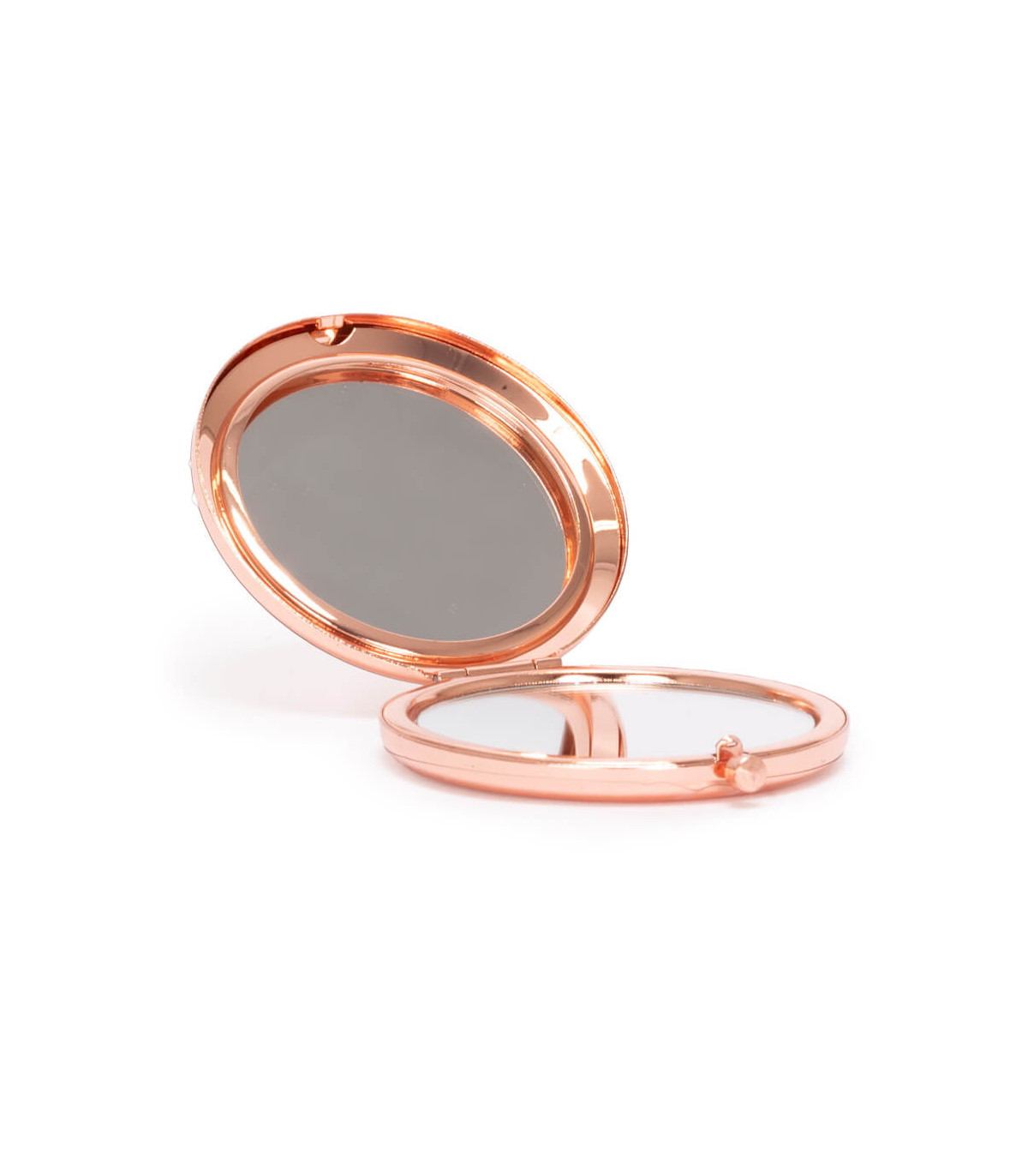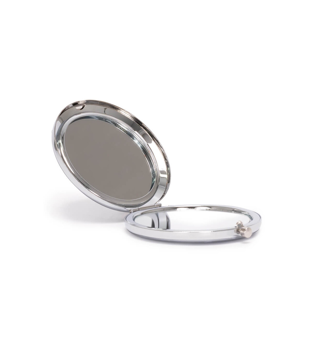 Espejo metálico de Acero inoxidable redondo doble. Interior con 2 espejos: uno normal, el otro con aumento. Presentación en bolsa espuma frozen + caja de cartón laminado negro. IMPORTANTE: este espejo viene con sellos plásticos en ambas caras exteriores, para protegerlo de manchas y rayaduras. Antes de imprimir o grabar logo, preocúpese de retirar los sellos plásticos.