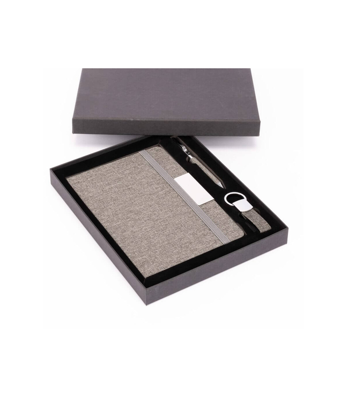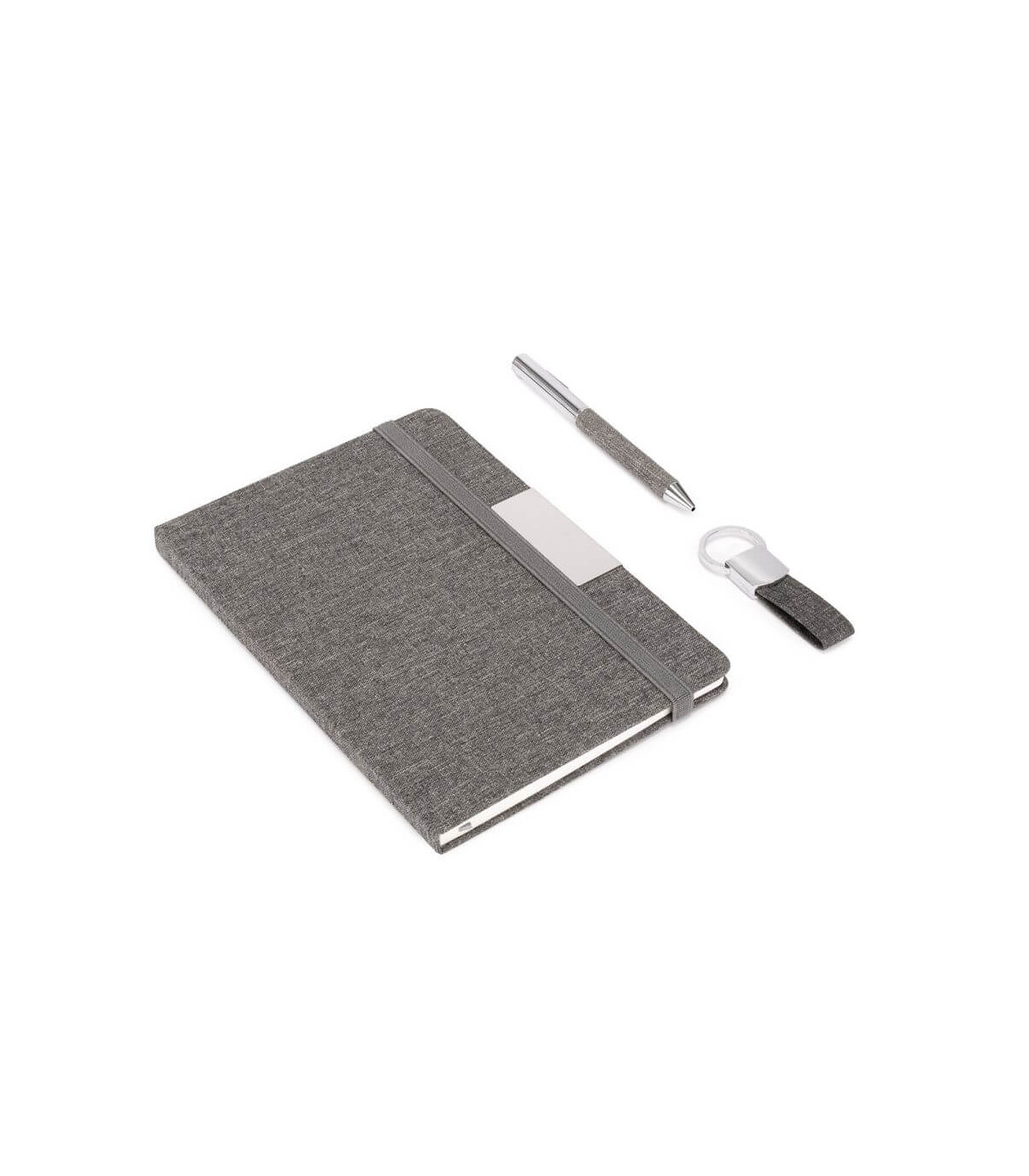 PARATY es un set corporativo que une tres piezas clave: Cuaderno con tapa de tela RPET, bolígrafo metálico con grip textil a juego y llavero con acabados cromados, todos en una elegante presentación negra. Sus materiales reciclados y diseño armónico crean una propuesta ideal para obsequios que buscan ir más allá de lo útil, integrando diseño y valores ambientales. Hazlo propio y proyecta una identidad de marca sólida, moderna y comprometida con la sostenibilidad.