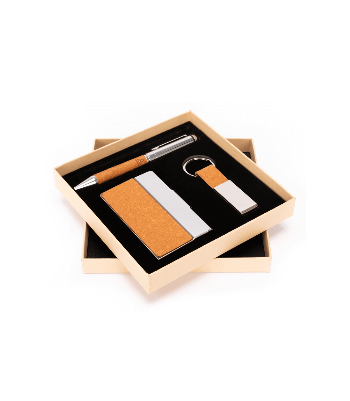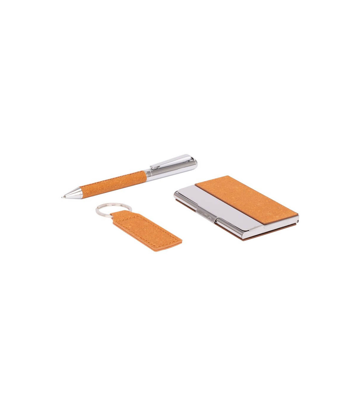 TORAJA es la síntesis perfecta entre sofisticación y autenticidad sustentable. El set incluye bolígrafo metálico con grip de cuero reciclado, llavero y porta tarjetas a juego, todo presentado en una caja de regalo kraft con interior moldeado en EVA. Su diseño en tonos naturales y materiales reutilizados expresa buen gusto y compromiso ambiental a partes iguales. Una oportunidad para que tu marca brille a través de un gesto refinado, útil y profundamente consciente.