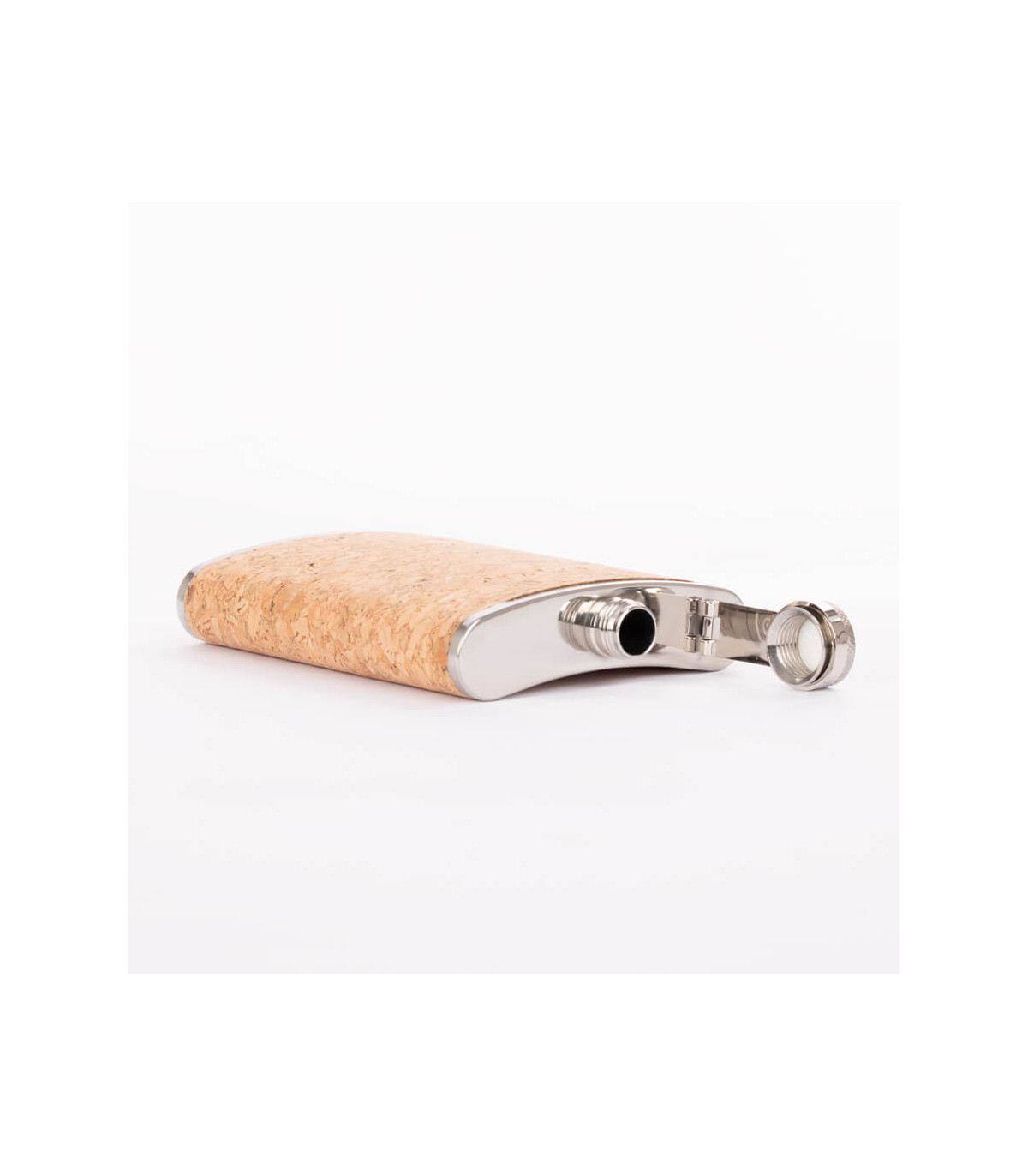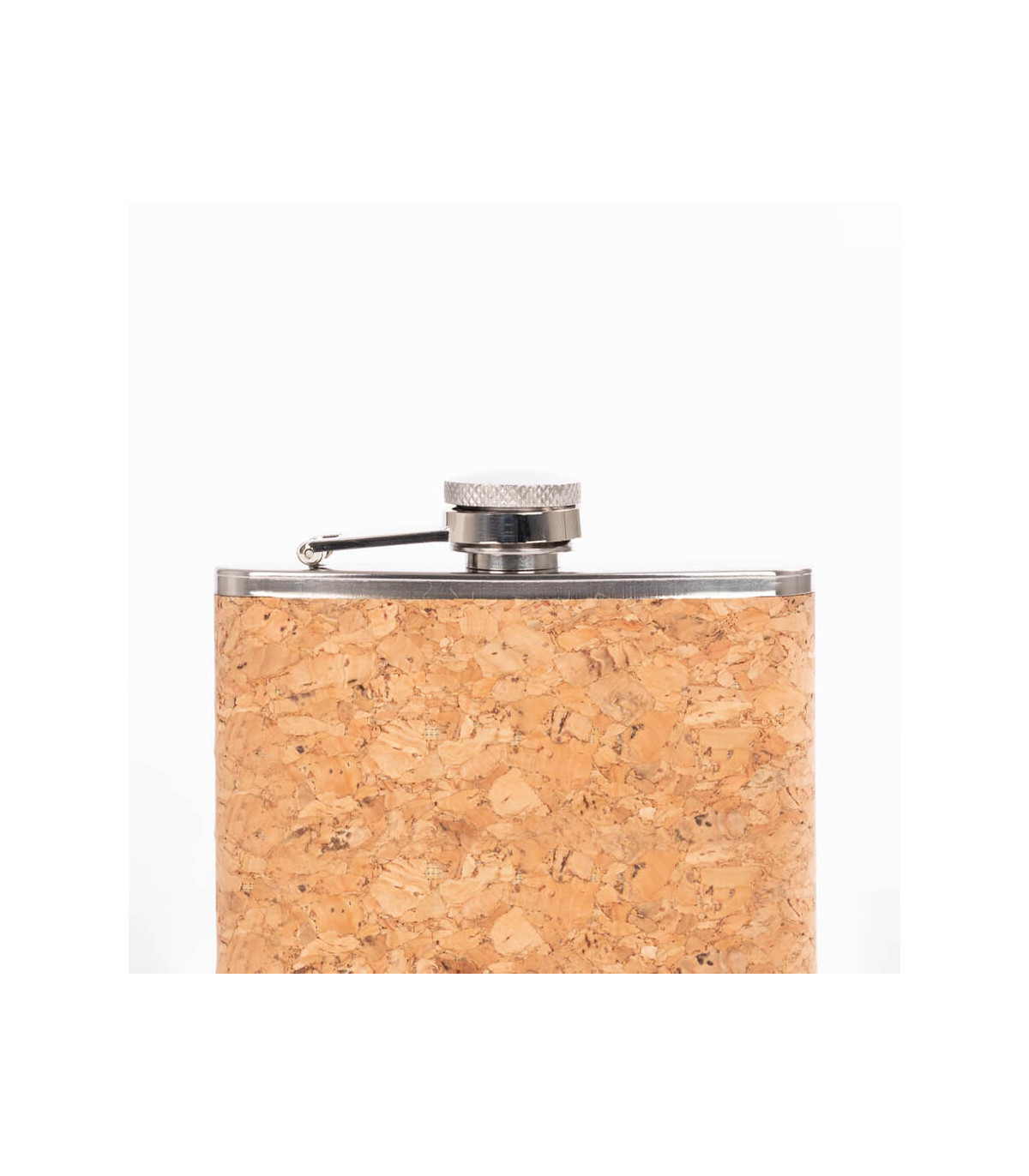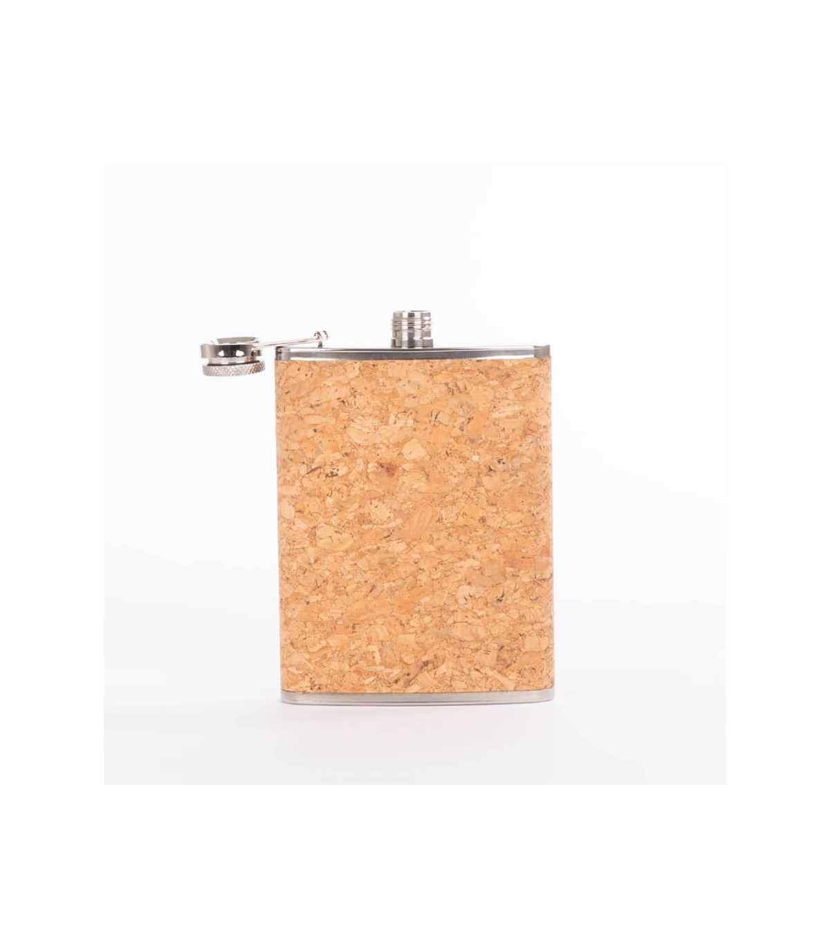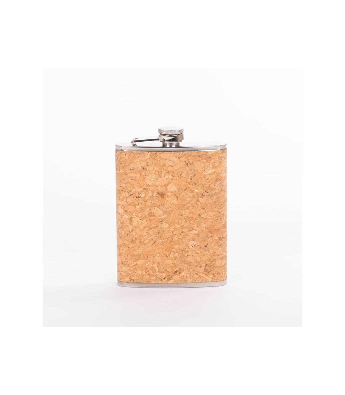 Petaca Licorera de Acero Inoxidable SS304, modelo «CORK», con cubierta de corcho natural. Capacidad 8 oz (237 ml). Presentación en bolsa OPP transparente + caja de cartulina negra.