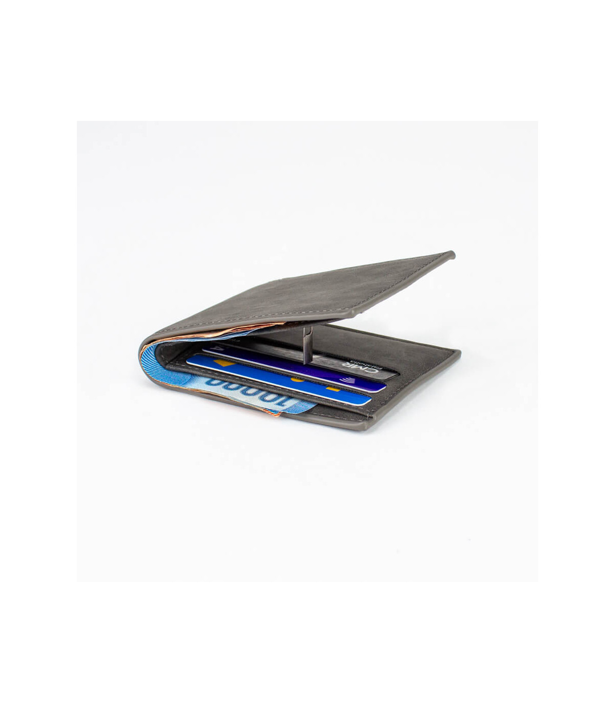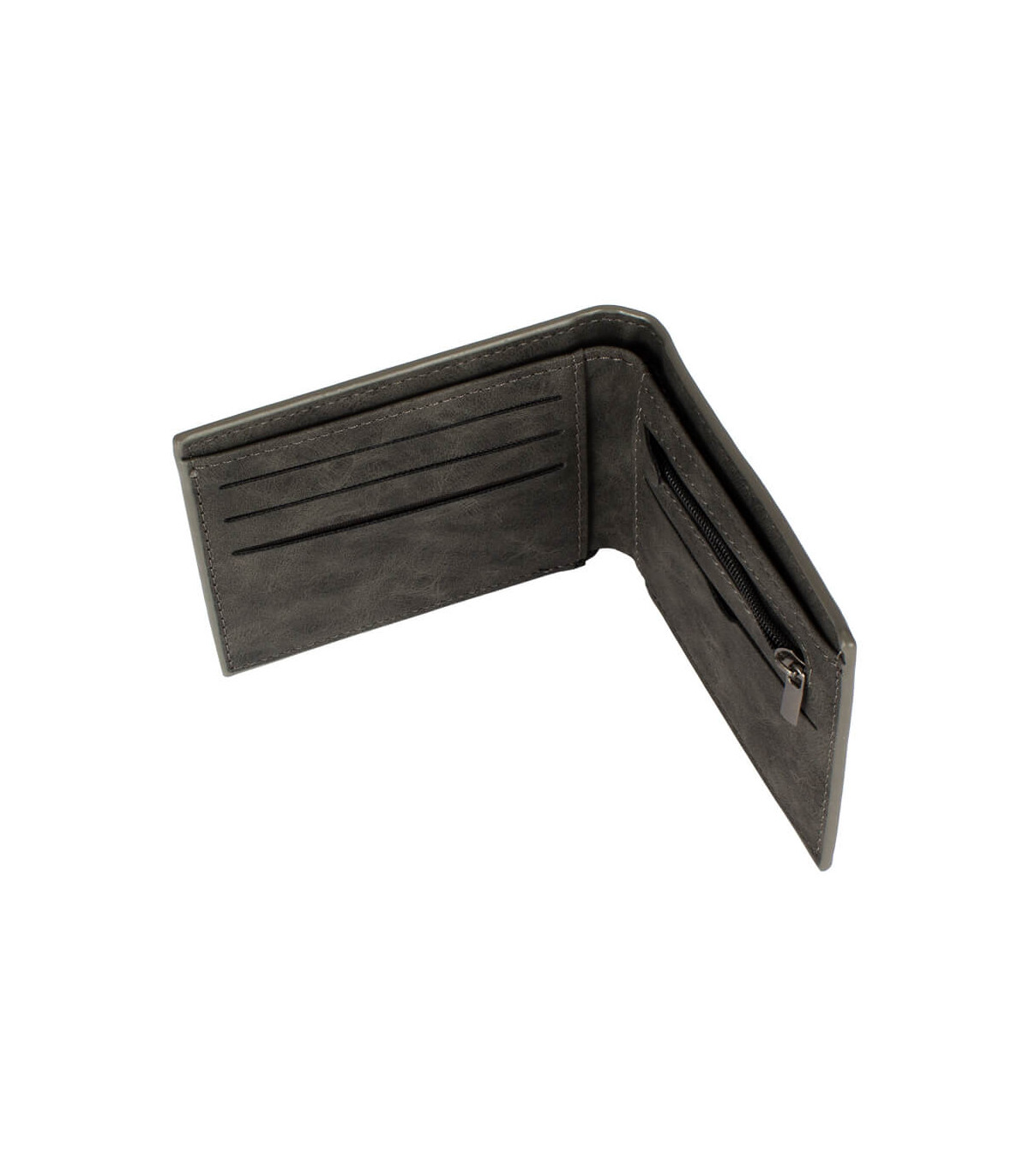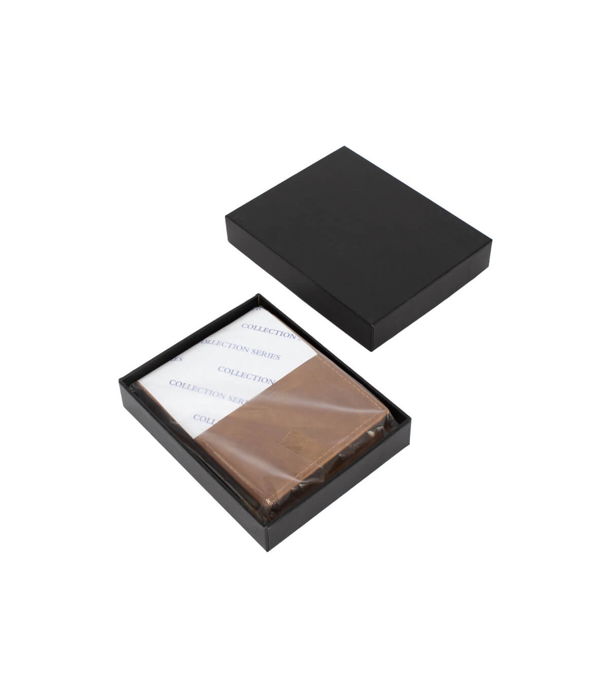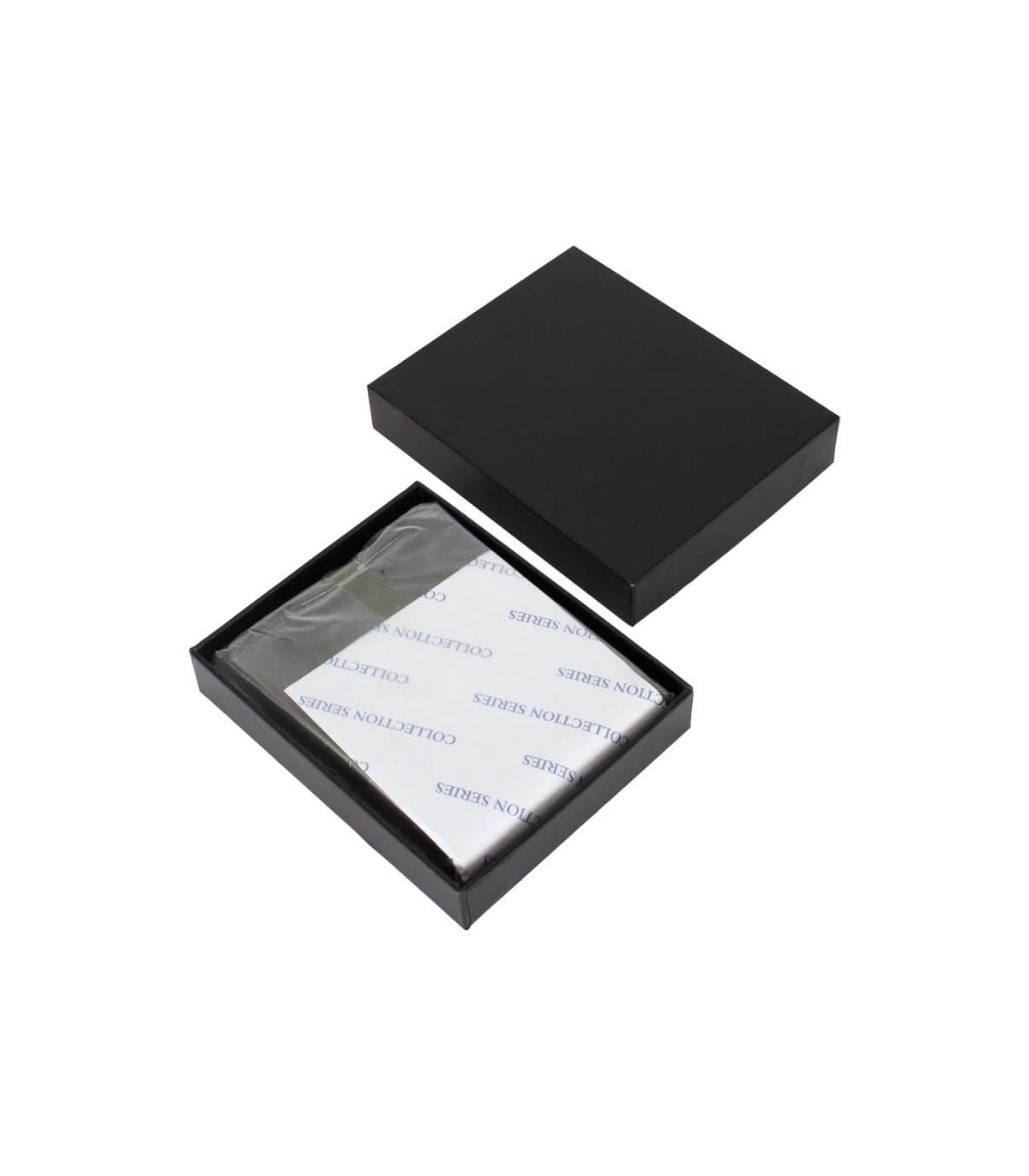 Billetera de eco-cuero, formato vertical, modelo «LAM». Contiene 5 compartimentos interiores. Presentación en bolsa frozen y caja de cartón forrado negro opaco.